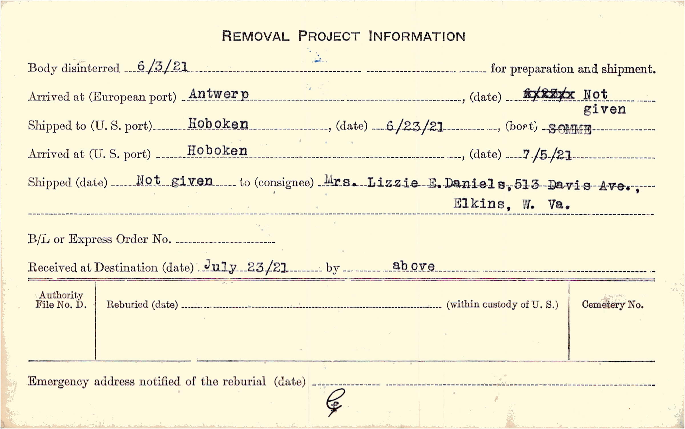 to Mrs. Lizzie E. Daniels, 513 Davis Ave., Elkins, W. Va.