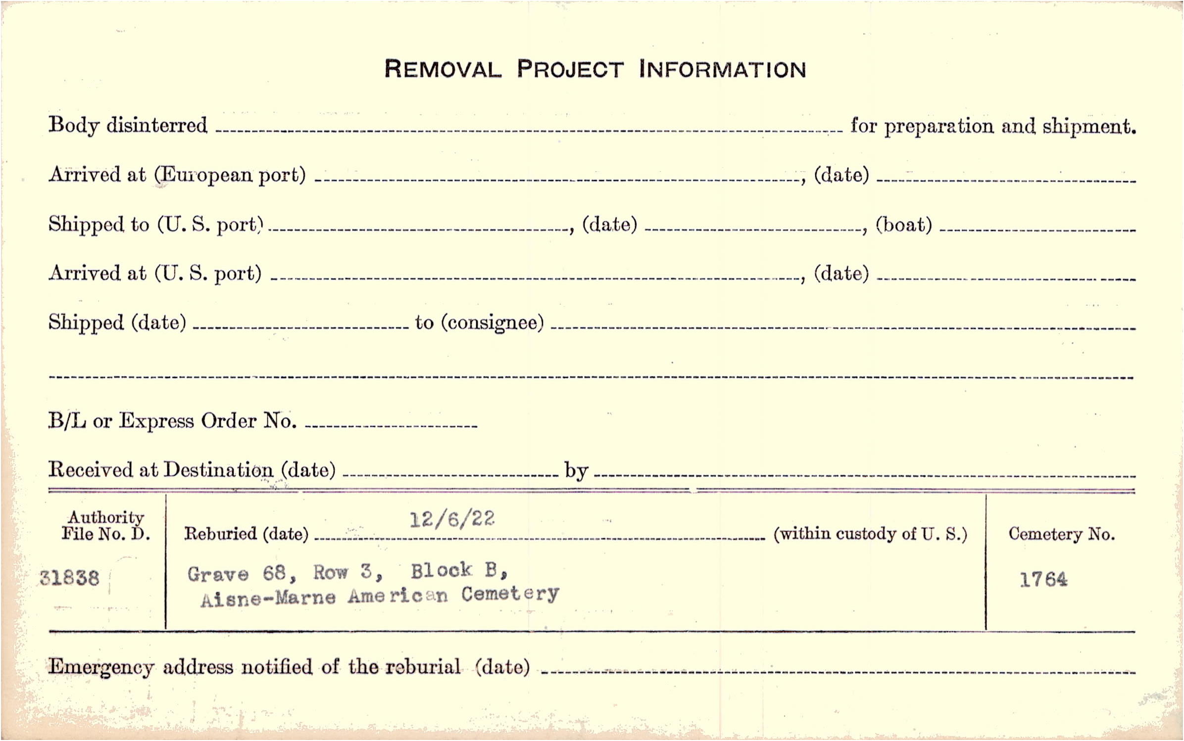 Grave 135, Section W, Plot 3, American Cemetery, Belleau, Aisne