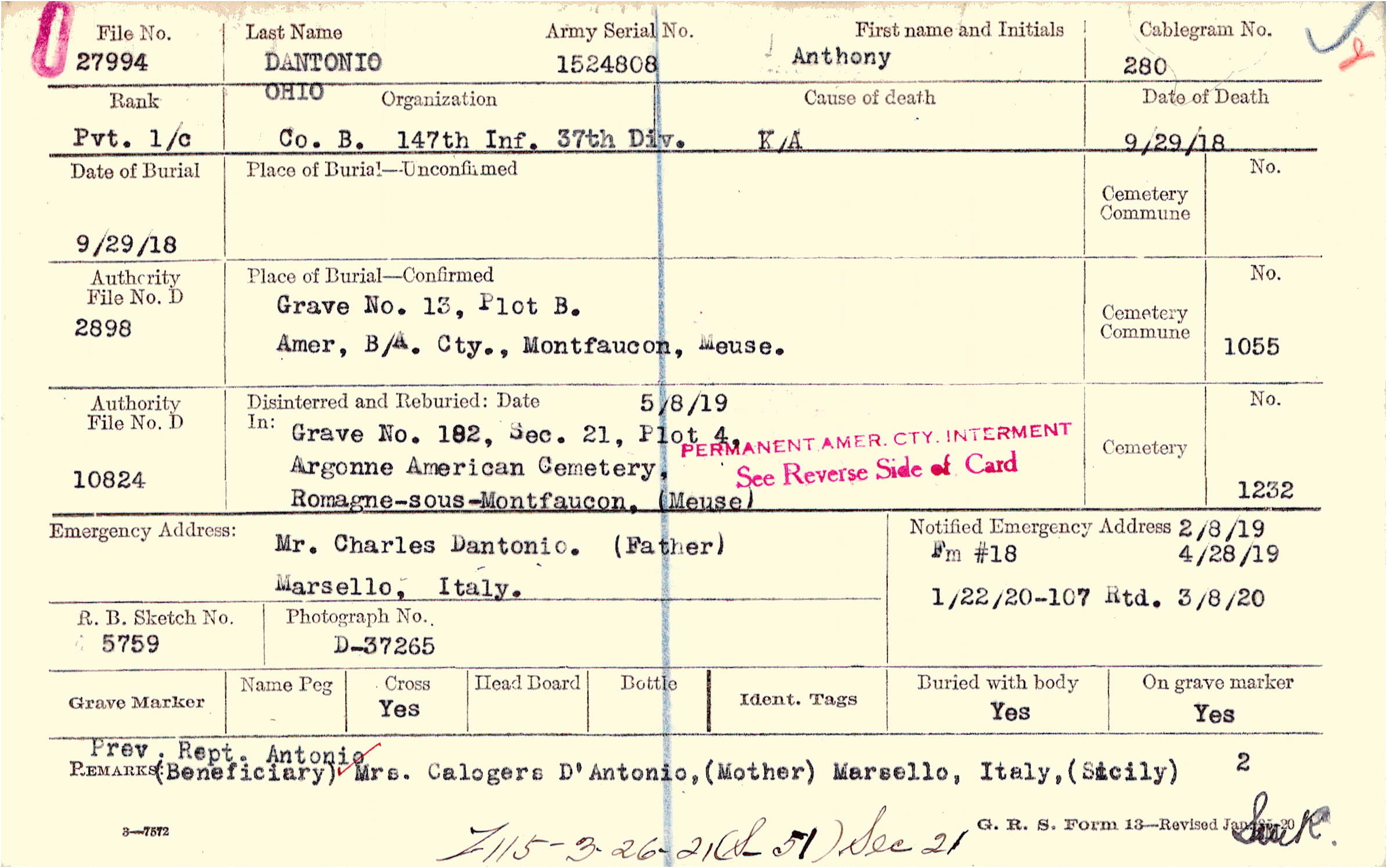 Prev. Rept. Antonie (Beneficiary) Mrs. Calogers D'Antonio, (Mother) Marsello, Italy, (Sicily), F115 - 3-26-21(S_51) Sec 21