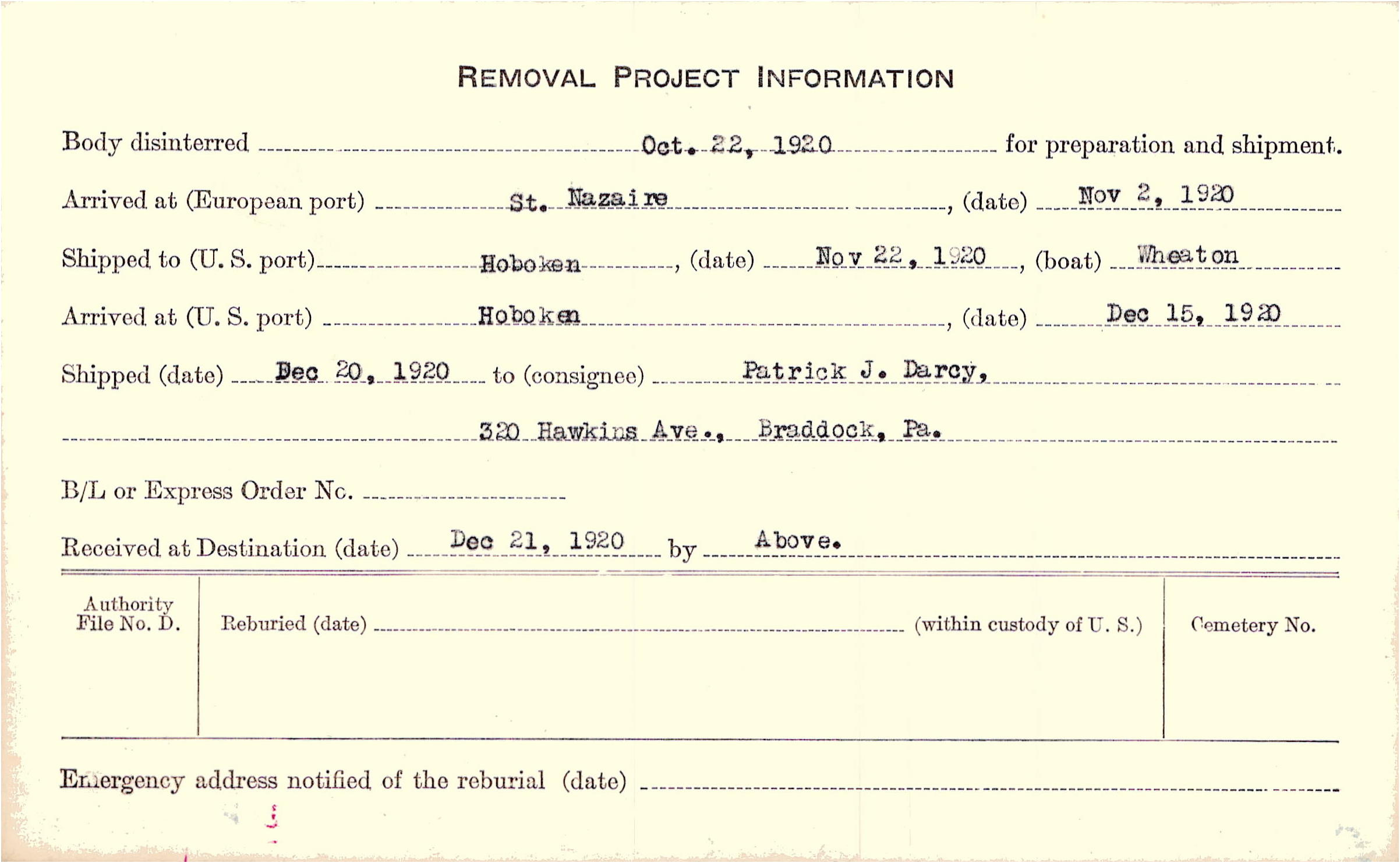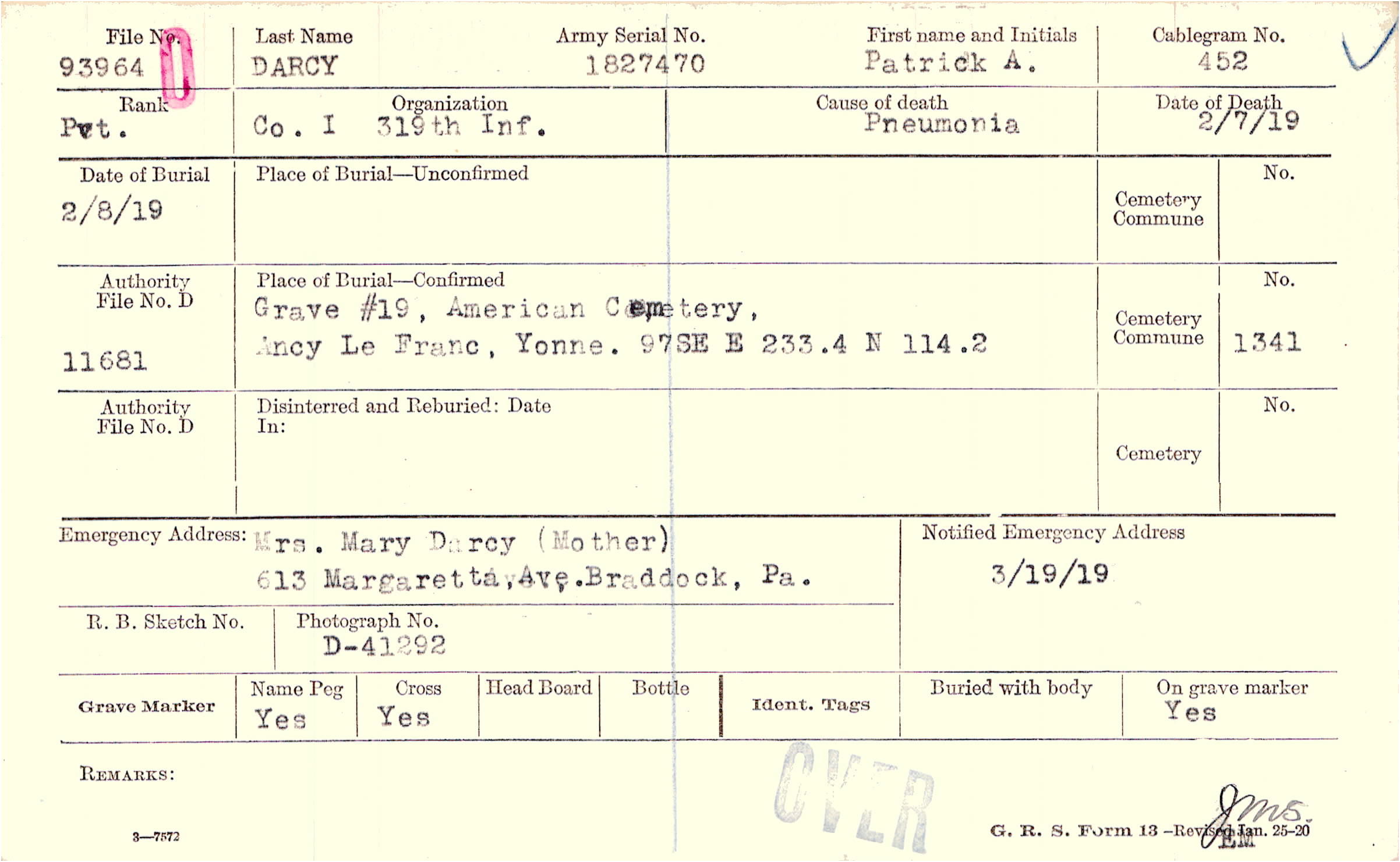 Mrs. Mary Darcy (Mother), 613 Margaretta Ave., Braddock, Pa.