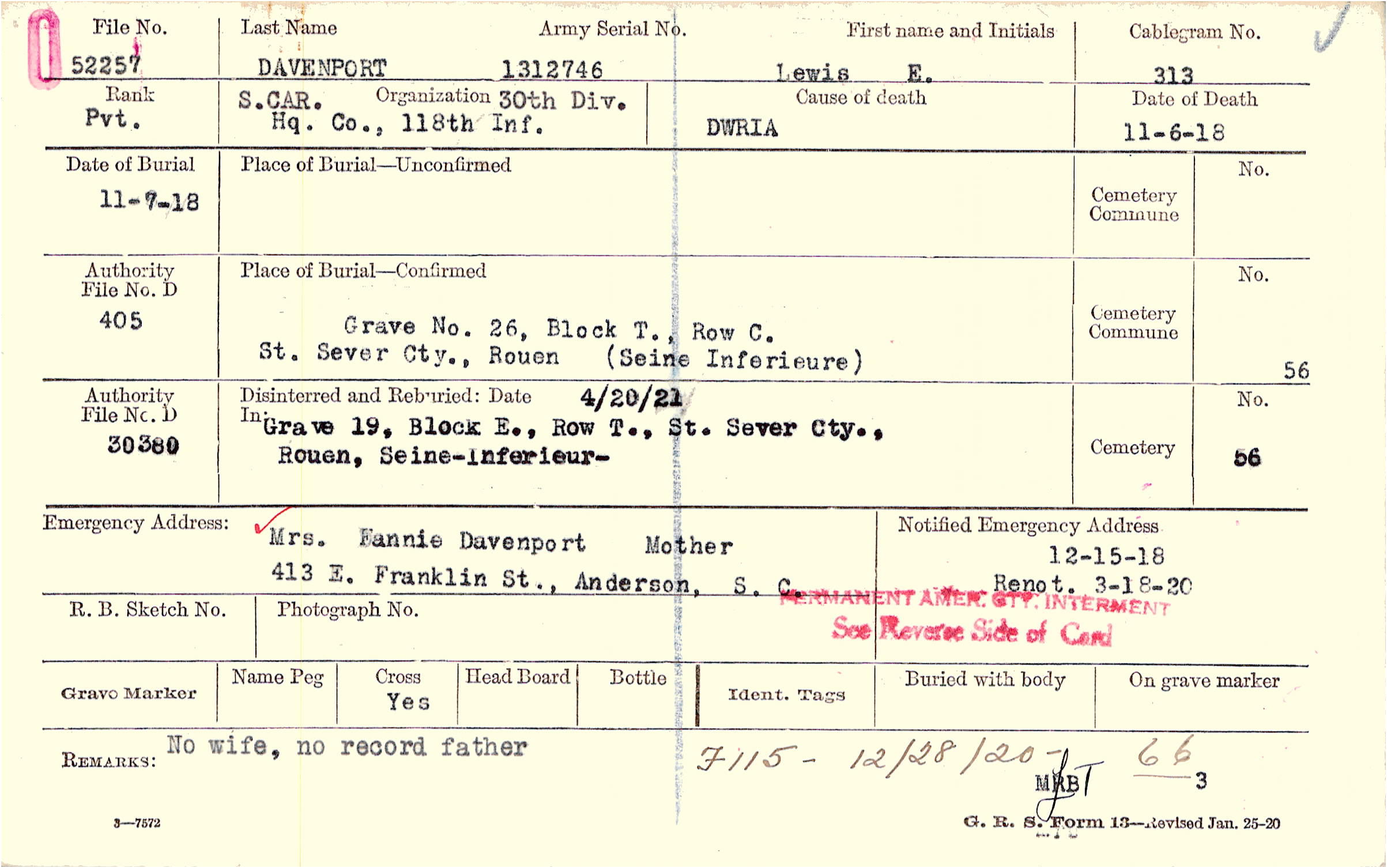 Grave 26, Block T., Row C. St. Sever Cty., Rouen (Seine Inferieure)