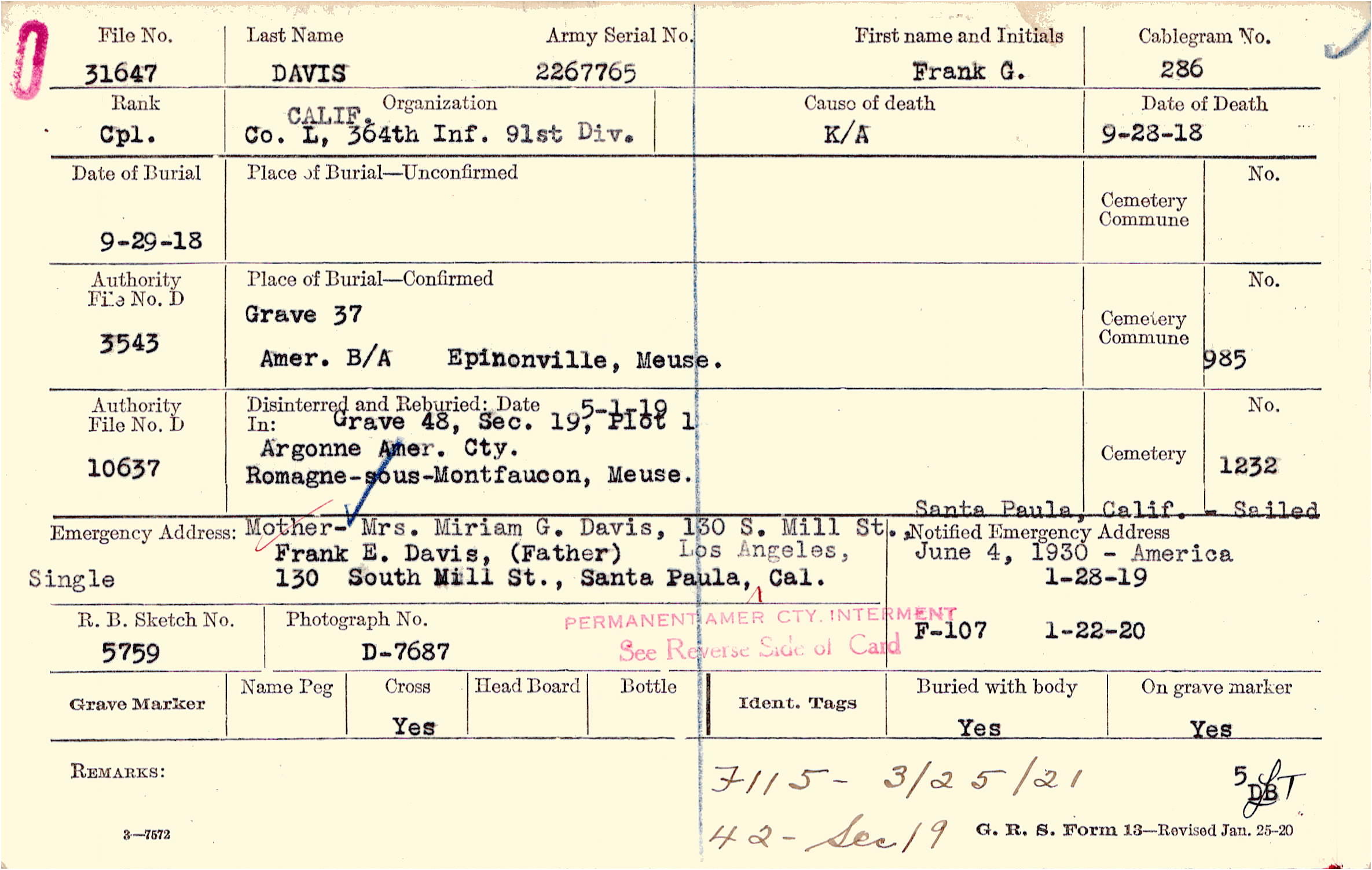 Grave 48, Section 19, Plot 1, Argonne American Cemetery, Romagne-sous-Montfaucon, Meuse