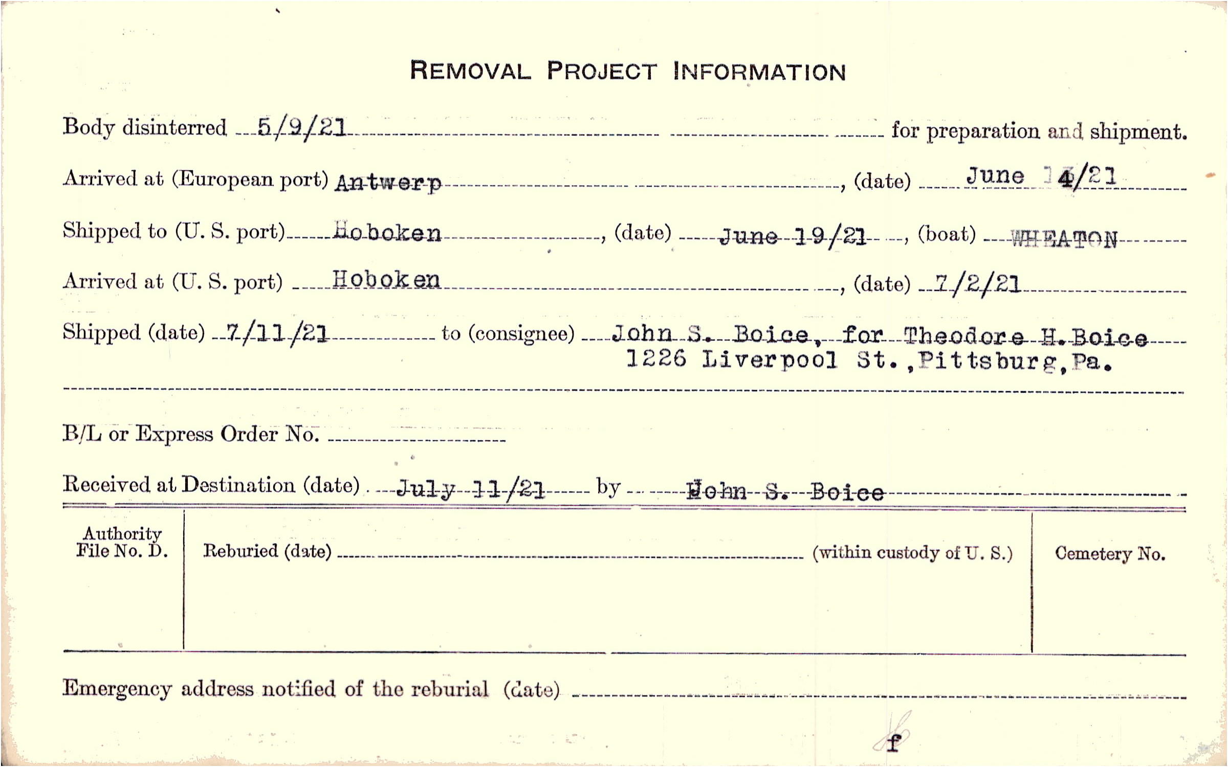 to John S. Boice, for Theodore H. Boice, 1226 Liverpool St., Pittsburg, Pa.