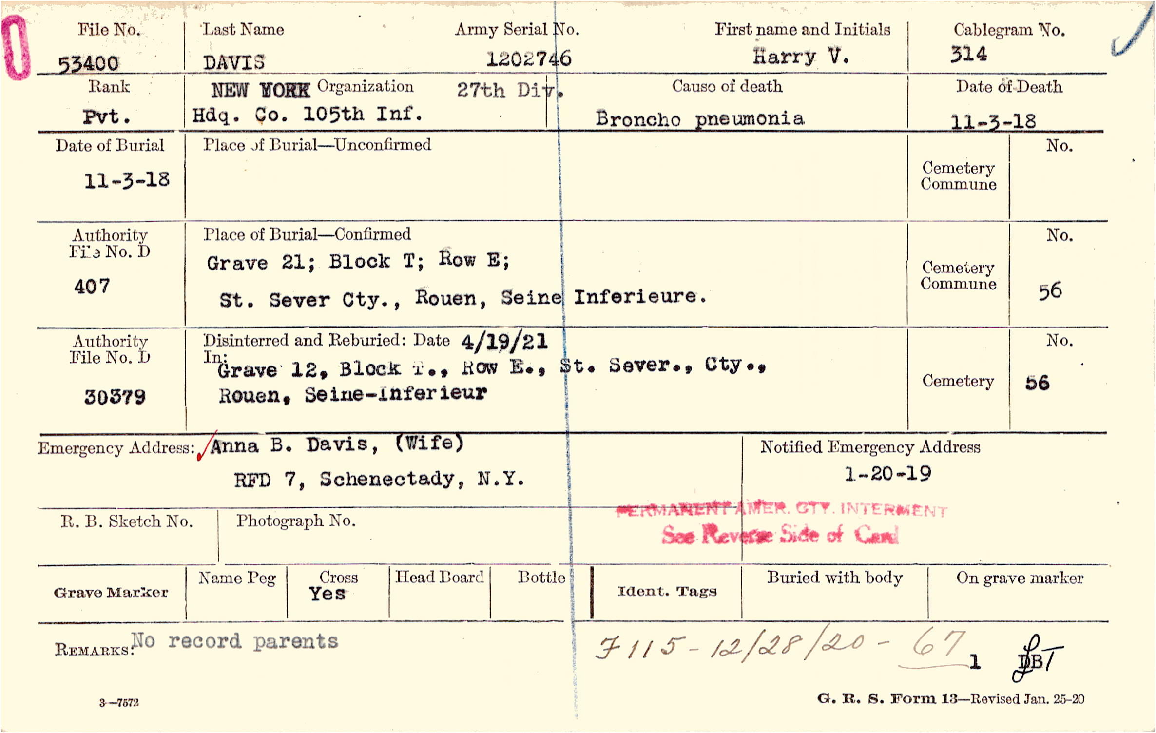 Anna B. Davis, (Wife), RFD 7, Schenectady, N.Y., No record of parents