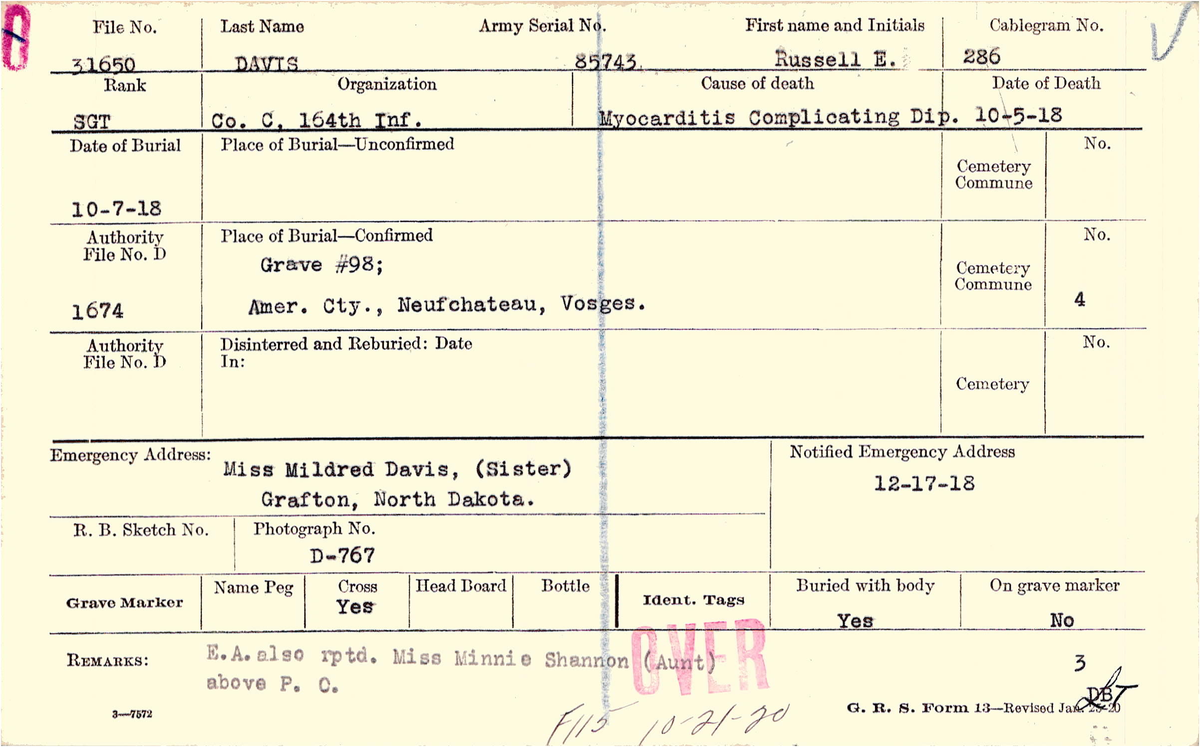 Grave #98, Amer. Cty., Neufchateau, Vosges.