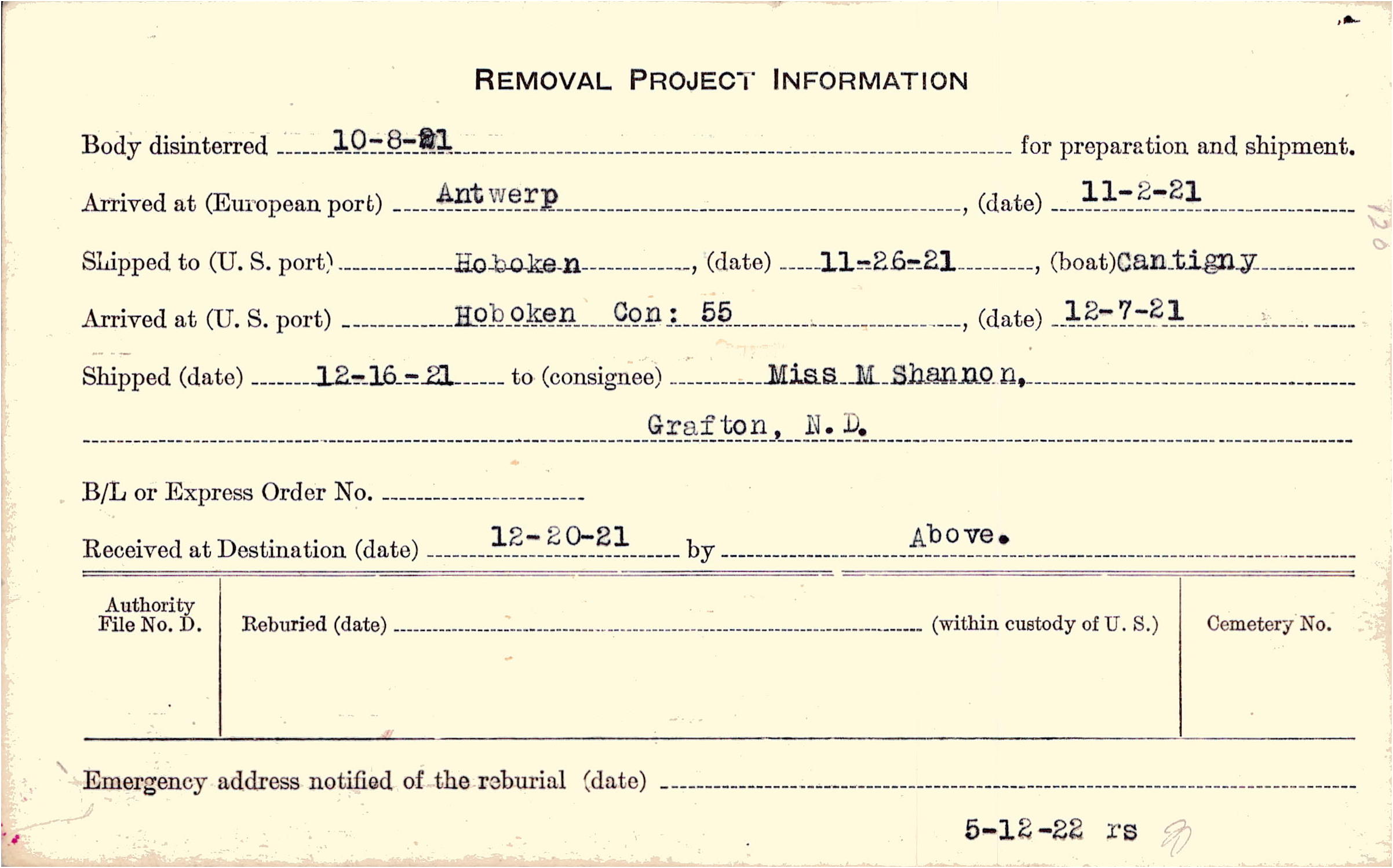 Body disinterred 10/8/1921 for preparation and shipment.