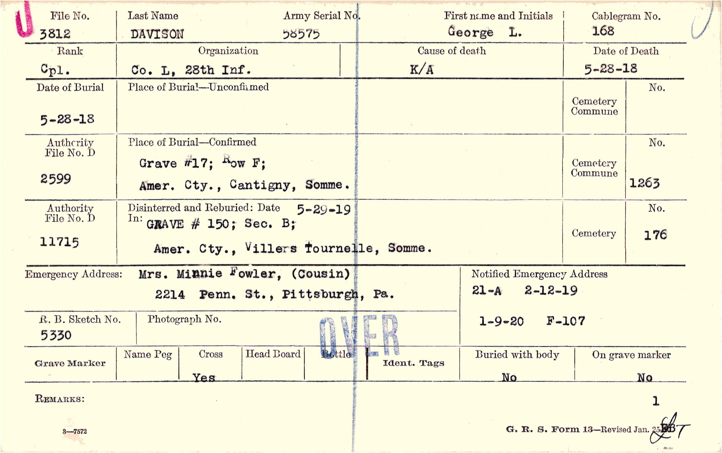 Grave #17; Row F; Amer. Cty., Cantigny, Somme.