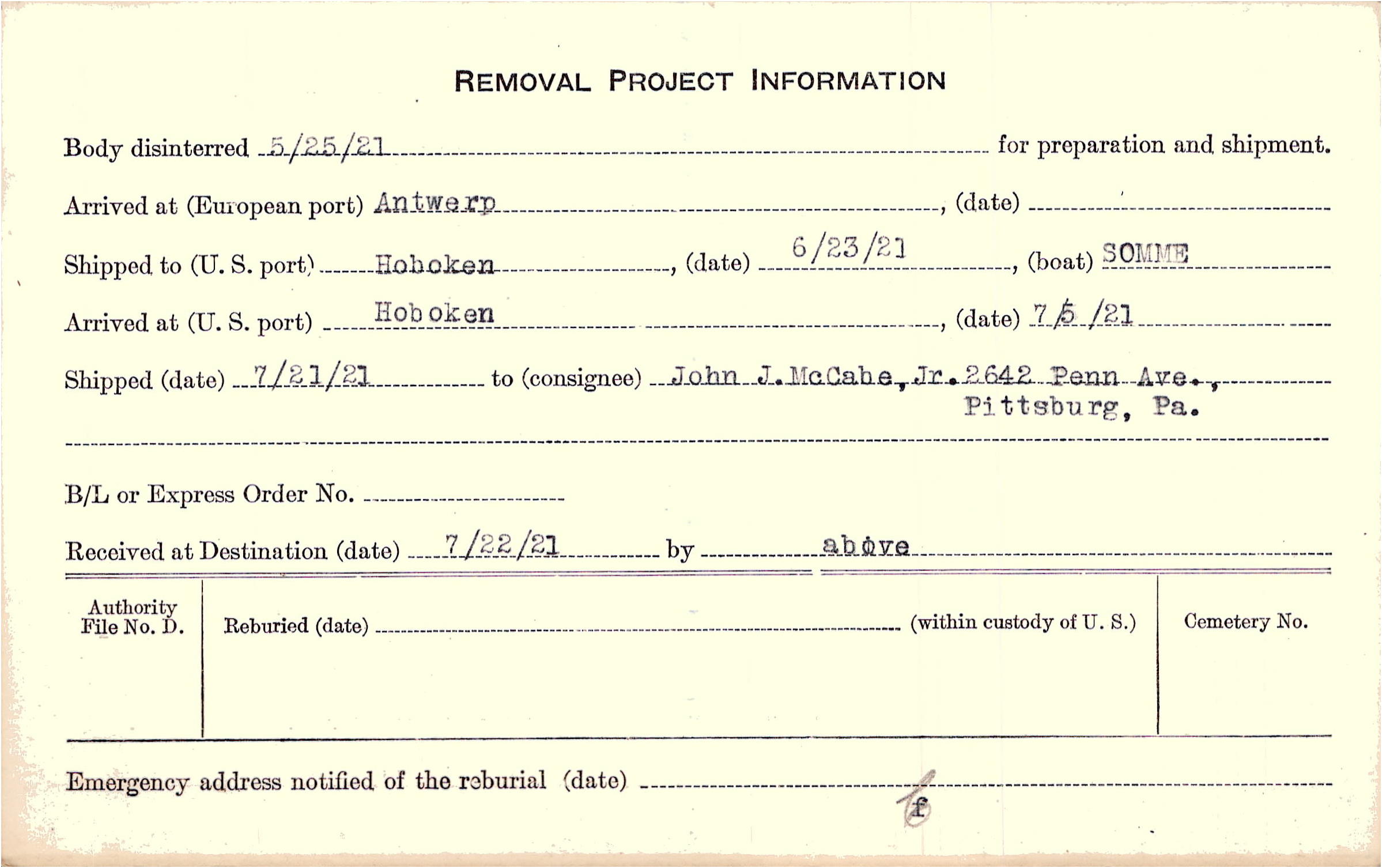 Body disinterred 5/25/1921 for preparation and shipment.