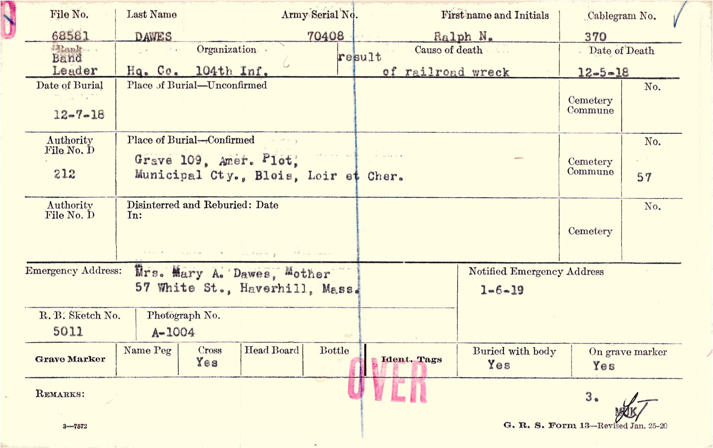 Grave 109, Amer. Plot, Municipal Cty., Blois, Loir et Cher.