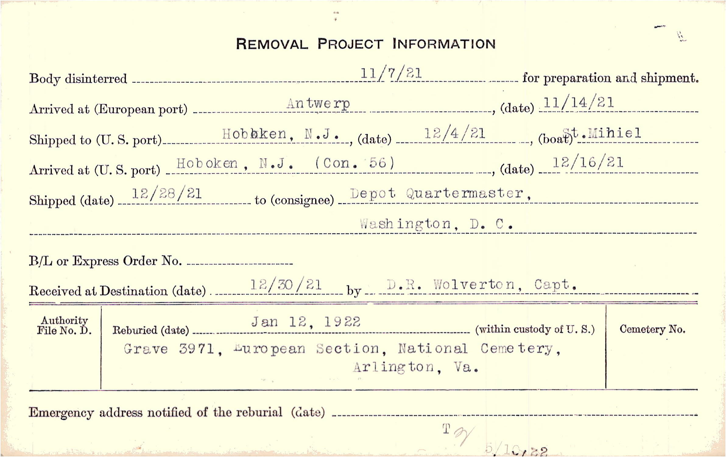 Body disinterred 11/7/1921 for preparation and shipment.