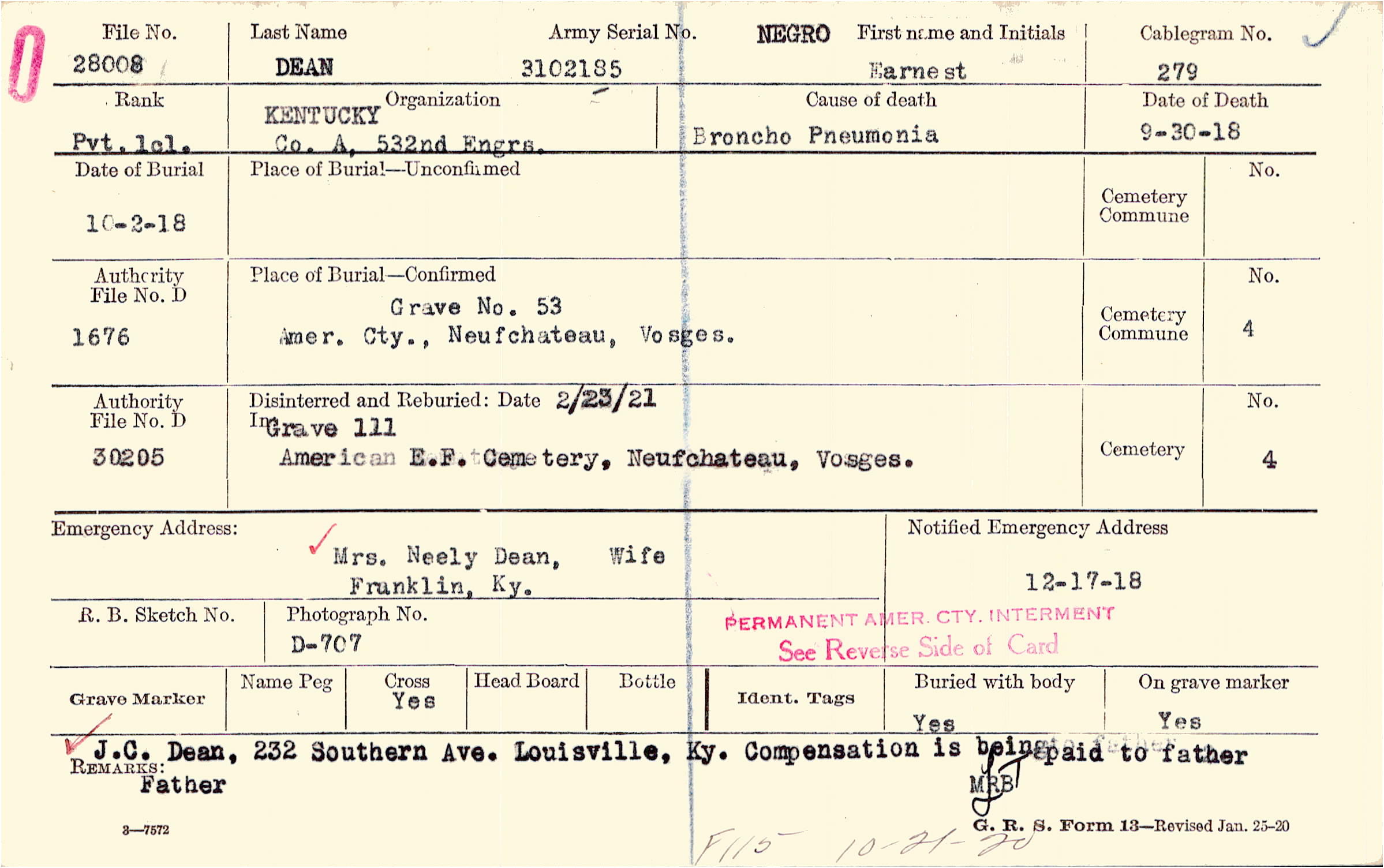 J.C. Dean, 232 Southern Ave., Louisville, Ky. Father Compensation is being paid to father.