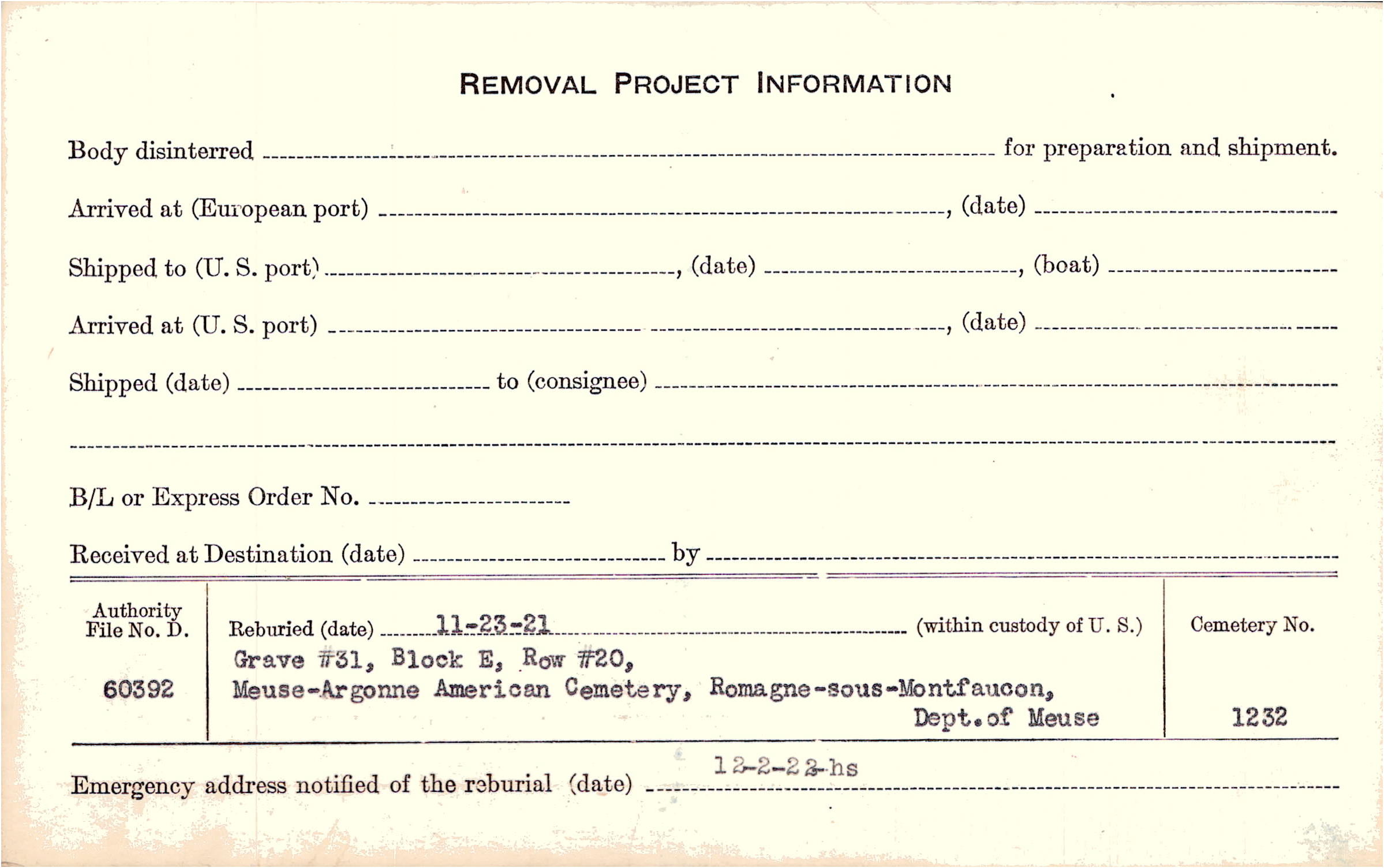 | Permanent Burial in Foreign Cemetery |