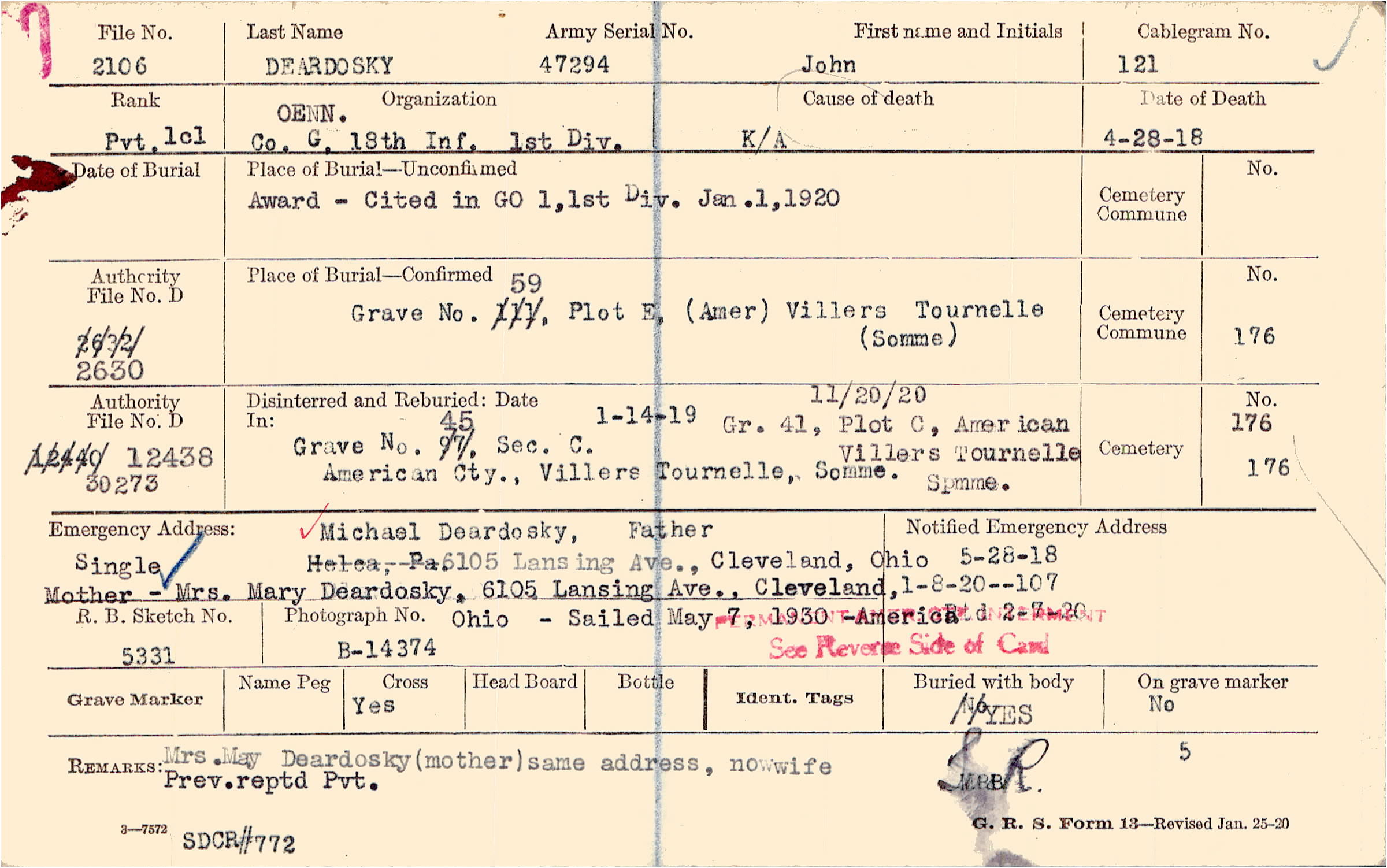 Mrs. May Deardosky (mother) same address, no wife Prev. reptd. Pvt., SDCR #772
