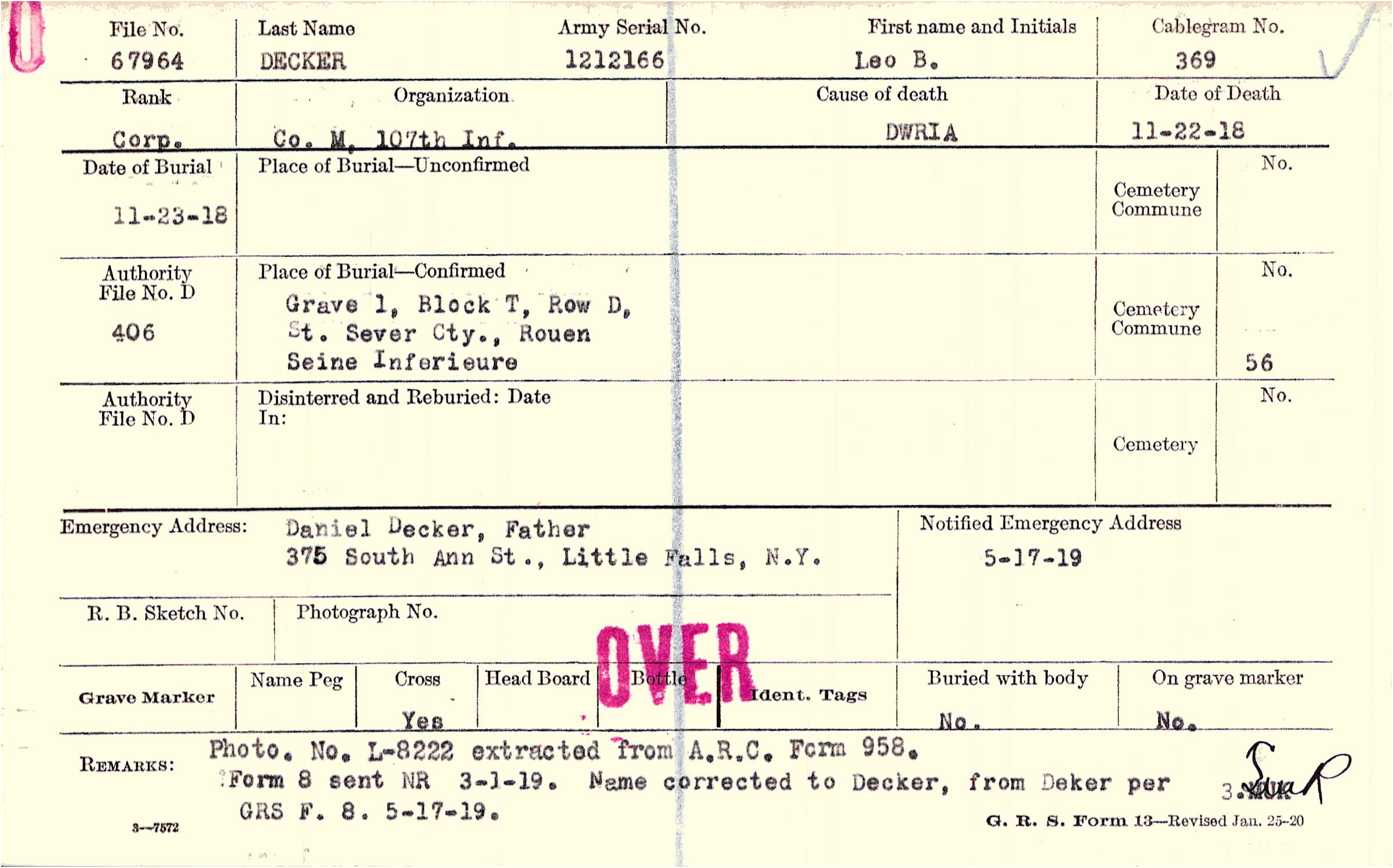 Photo/No. L-8222 extracted from A.R.C. Form 958. Name corrected to Decker from Deker per GRs F.8. 5-17-19,, Form 8 sent NR 3-1-19. Name corrected to Decker, from Deker per GRS F. 8. 5-17-19.