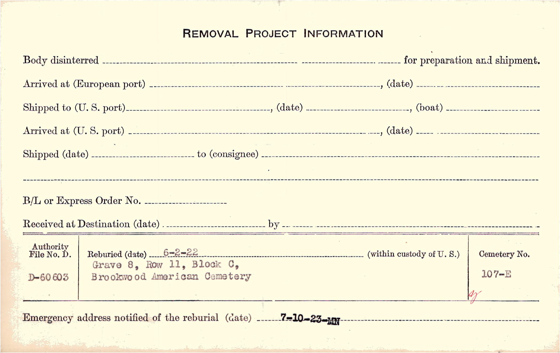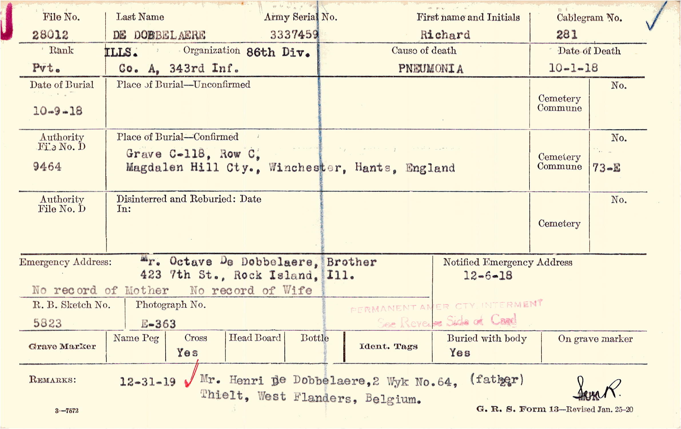 Mr. Octave De Dobbelaere, Brother, 423 7th St., Rock Island, Ill., No record of Mother No record of Wife