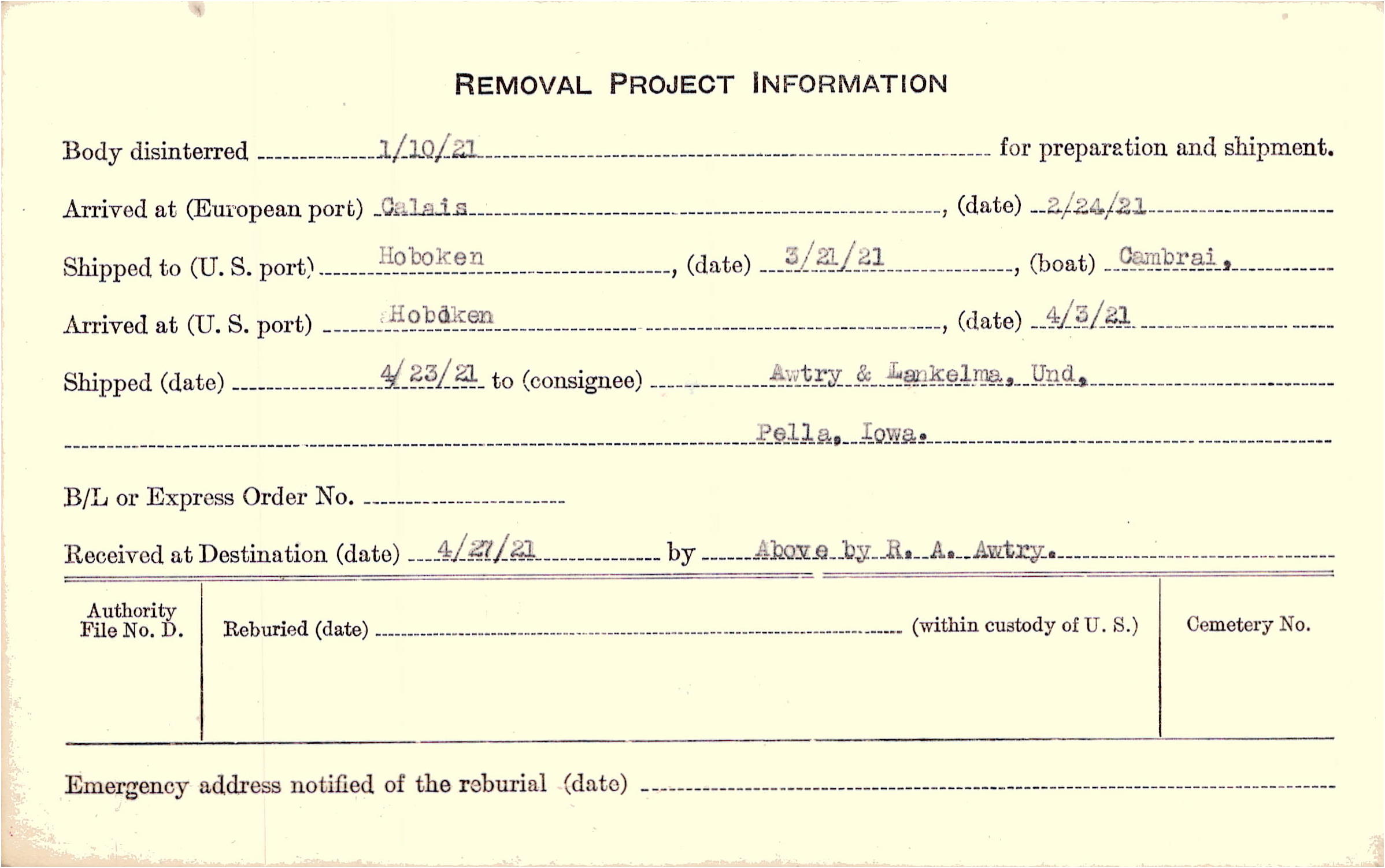 Body disinterred 1/10/1921 for preparation and shipment.