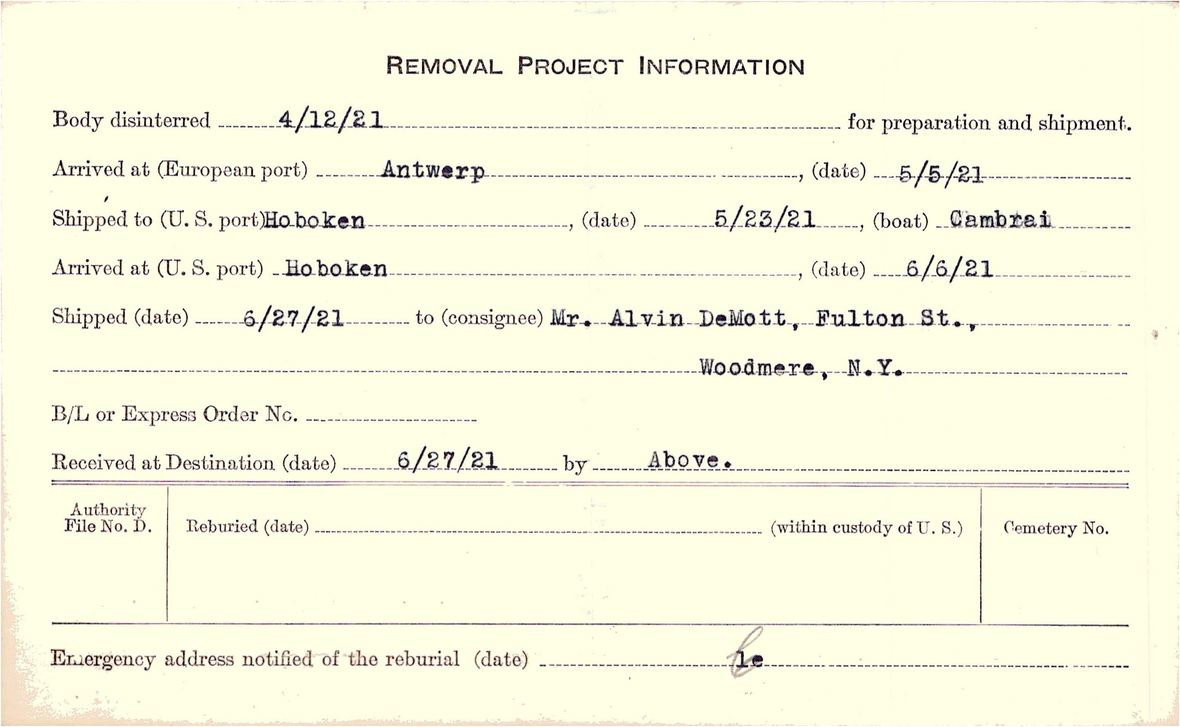 Body disinterred 4/12/1921 for preparation and shipment.