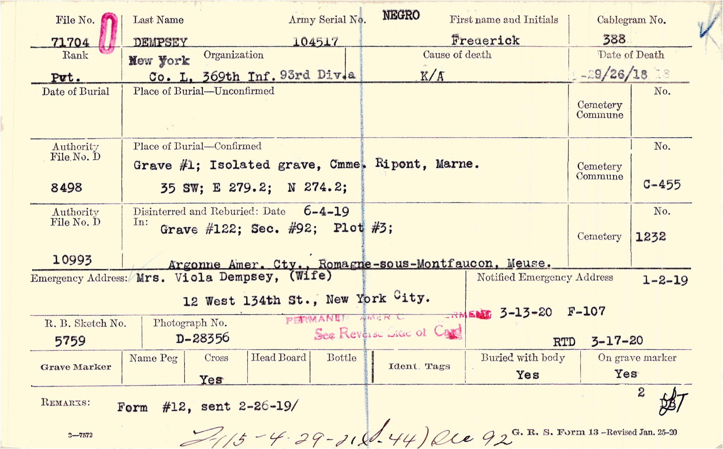 Mrs Viola Dempsey, ( Wife), 12 West 134th St., New York City.