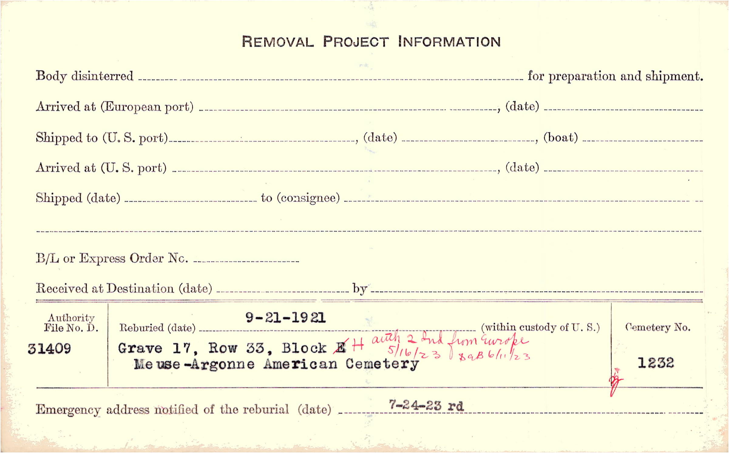 | Permanent Burial in Foreign Cemetery |