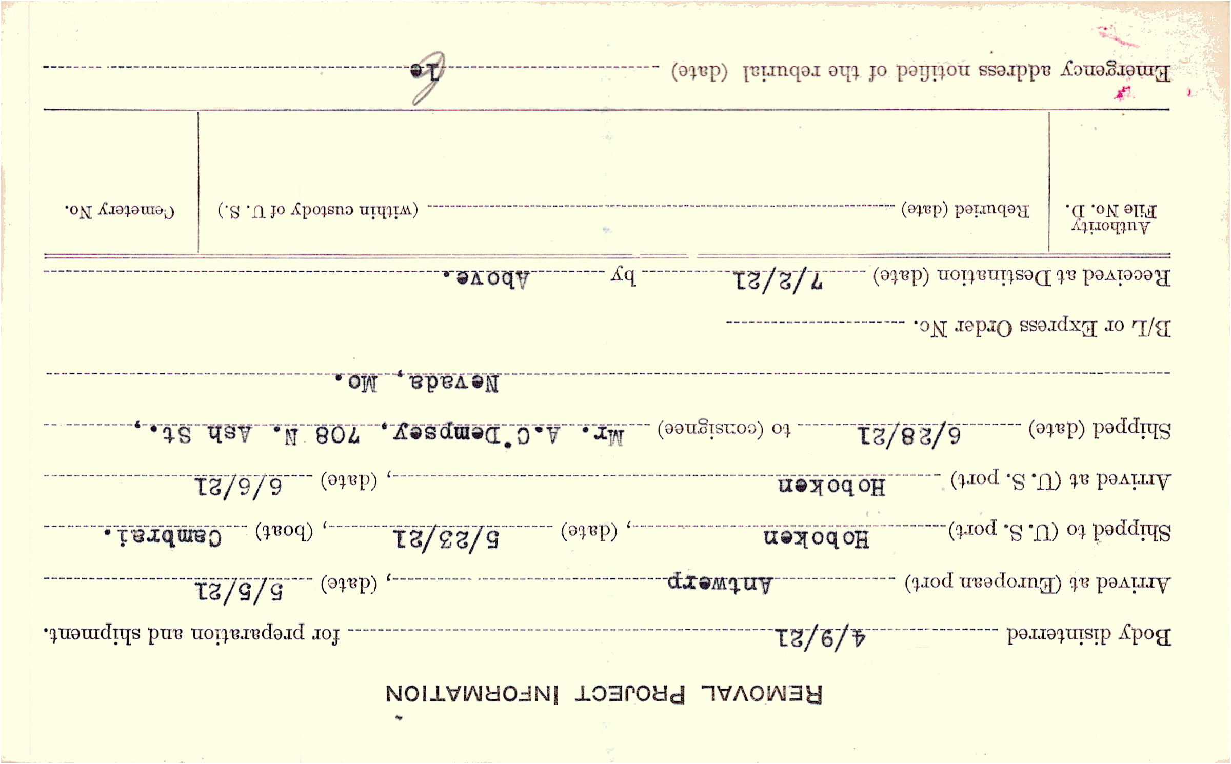 Body disinterred 4/9/1921 for preparation and shipment.