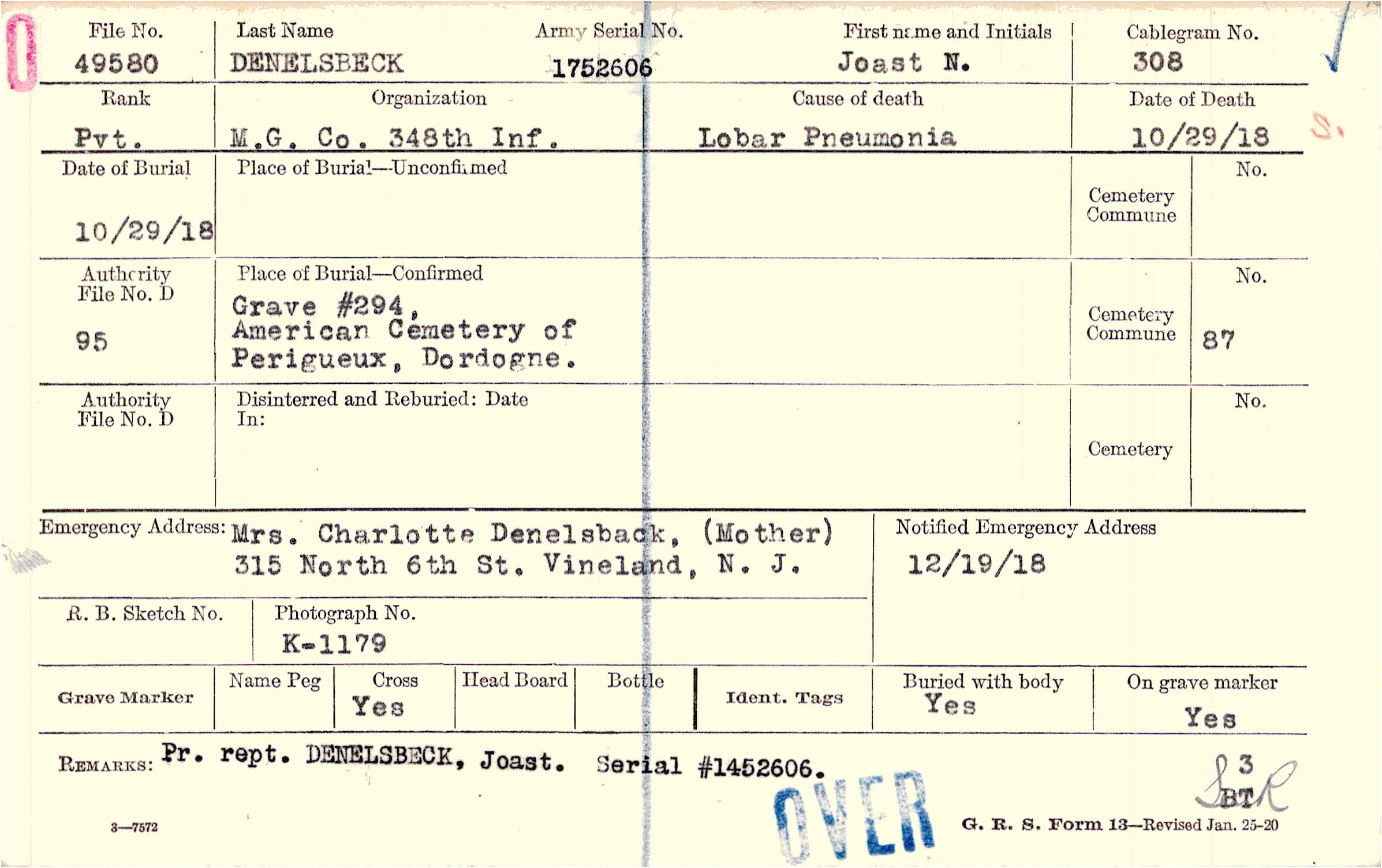 Mrs. Charlotte Denelsback, (Mother), 315 North 6th St. Vineland, N. J.