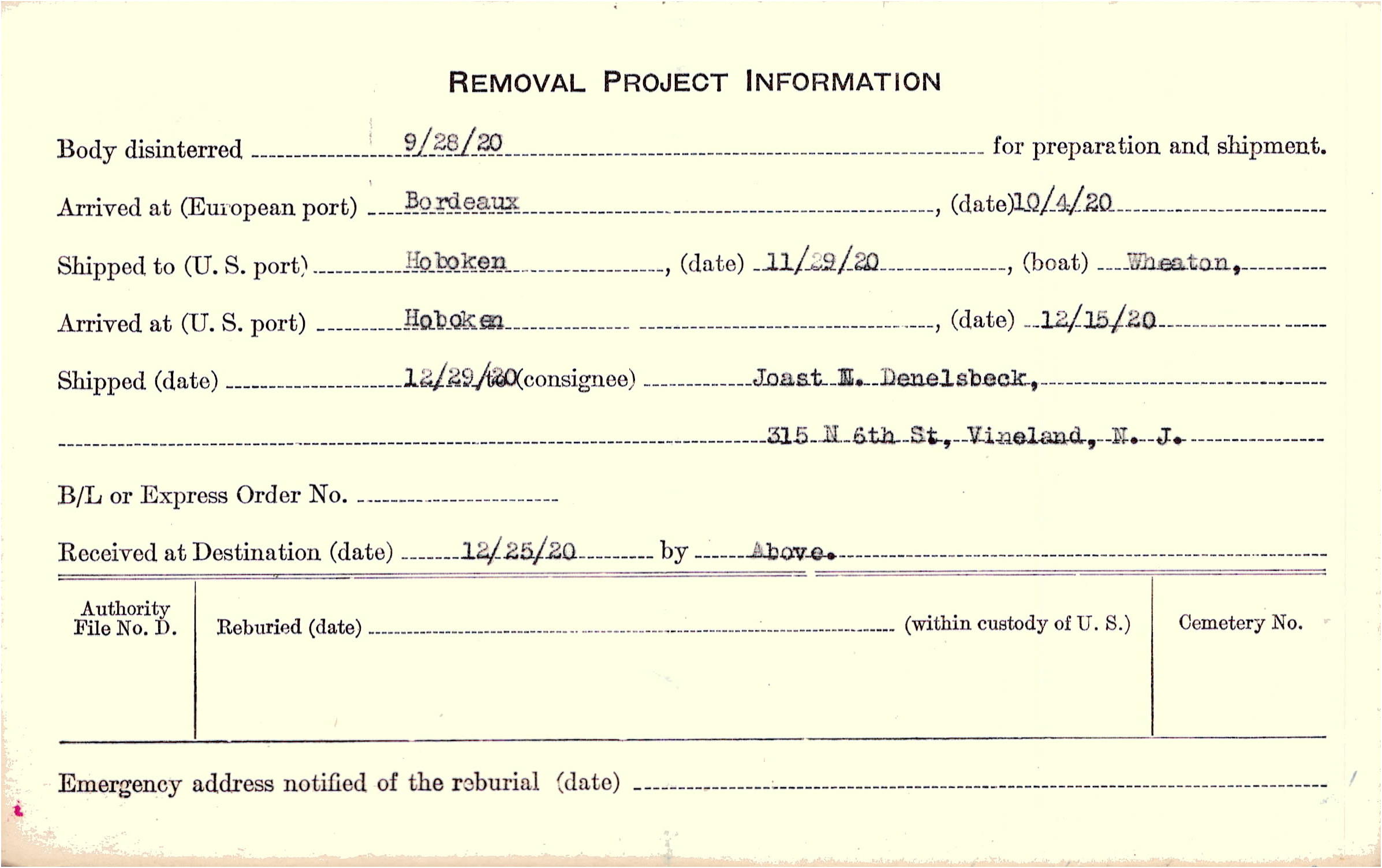 Body disinterred 9/28/1920 for preparation and shipment.