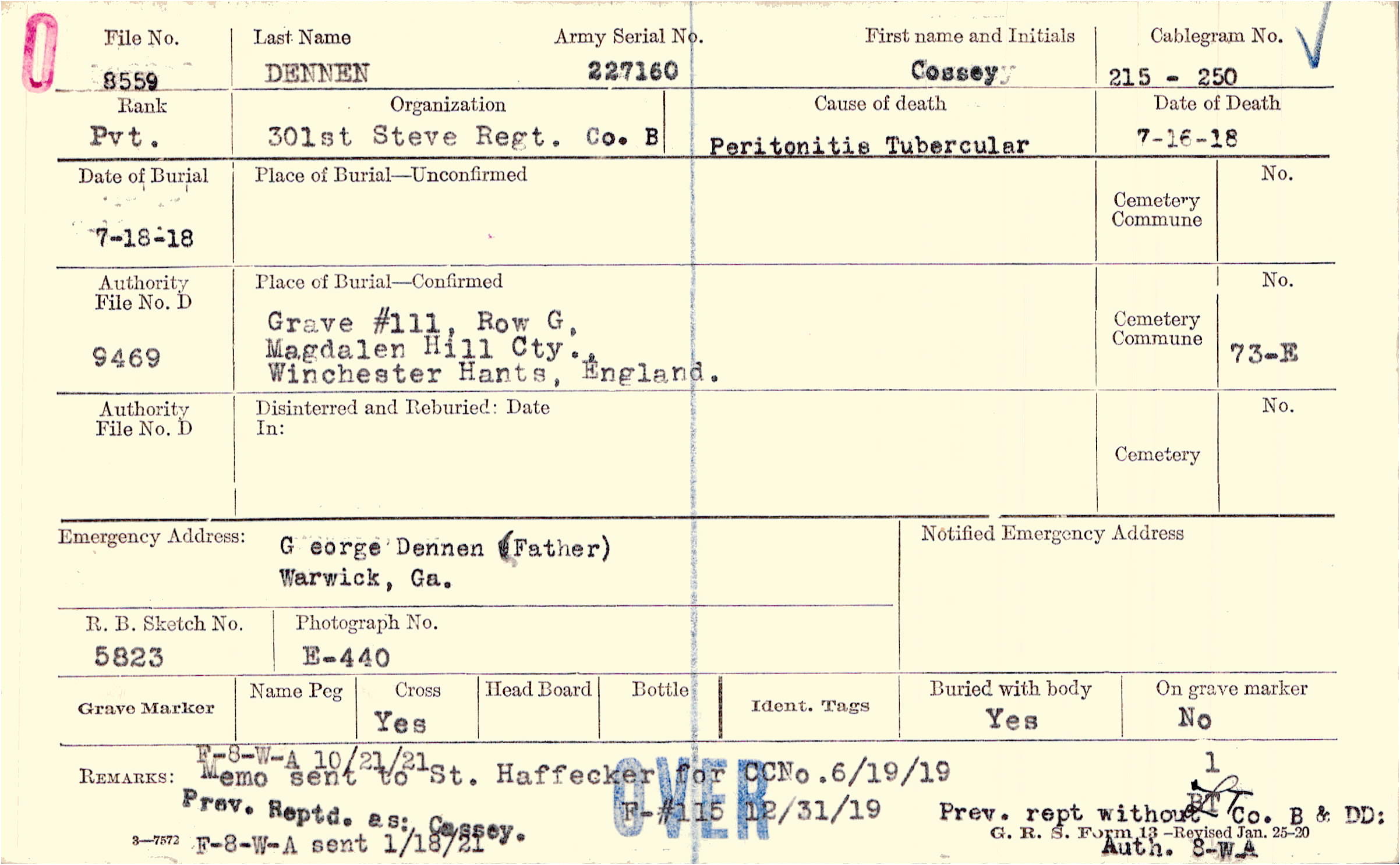 Grave #111, Row G, Magdalen Hill Cty., Winchester, Hants, England.
