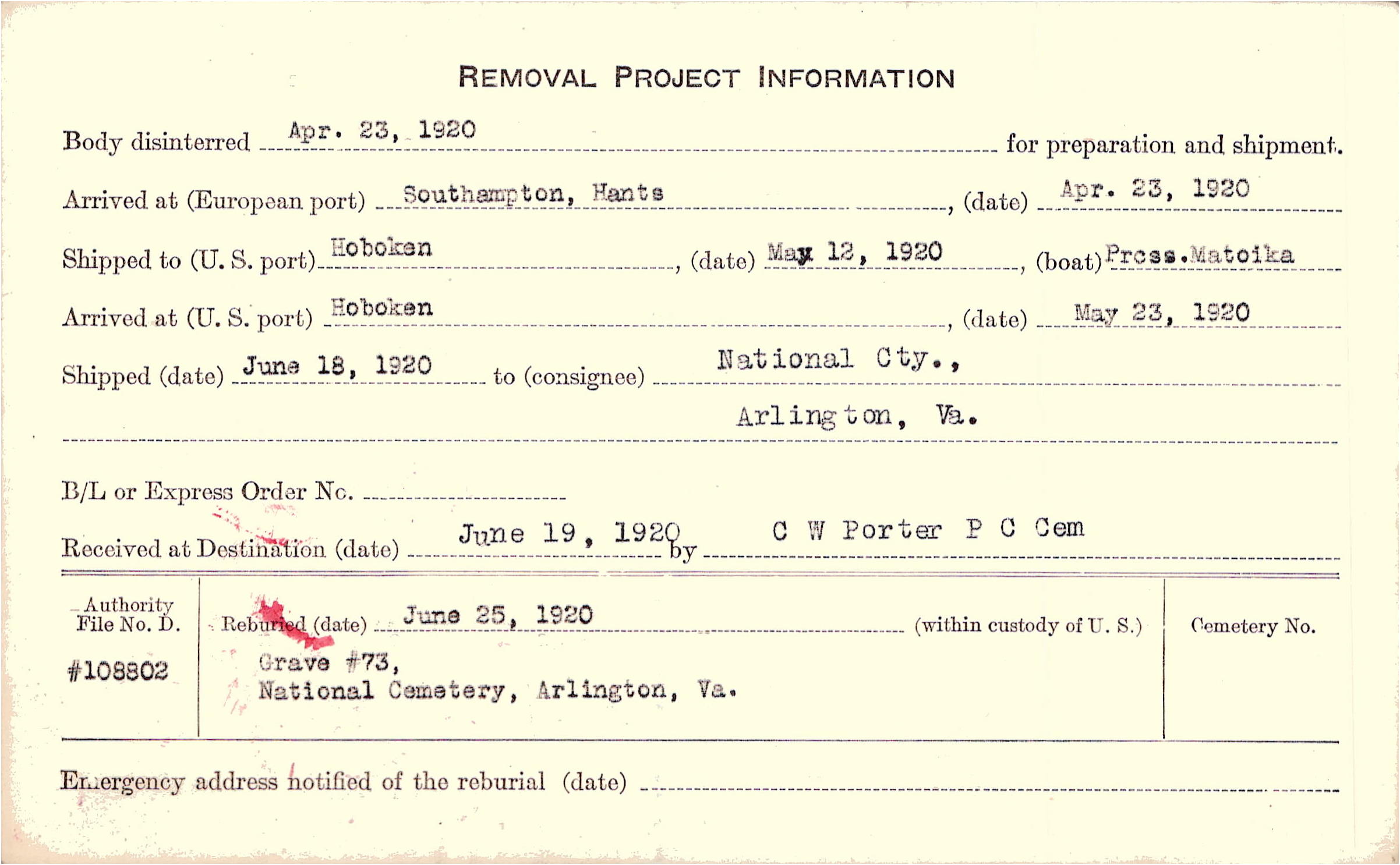 Body disinterred 4/23/1920 for preparation and shipment.