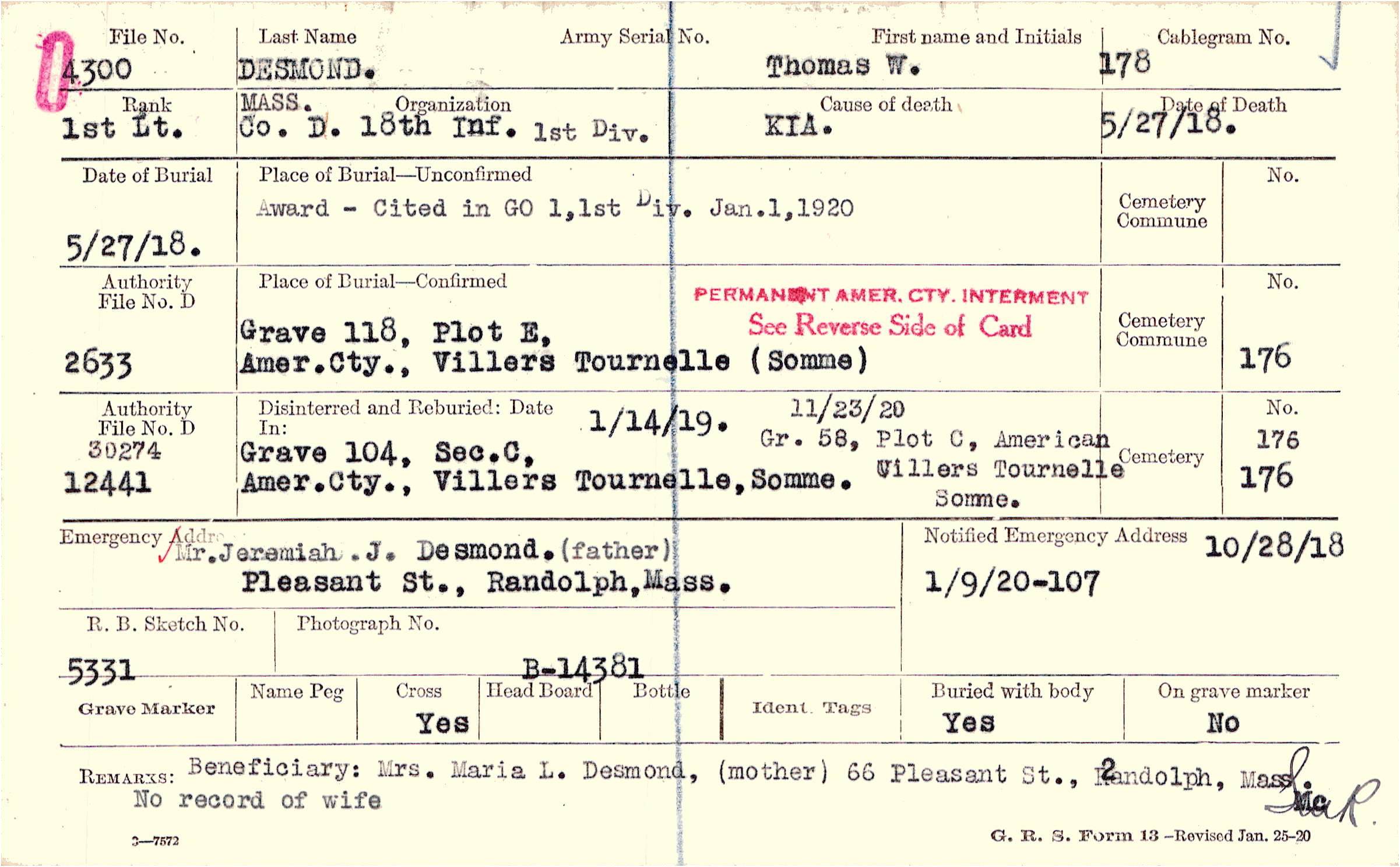 Mr. Jeremiah. J. Desmond.(father), Pleasant St., Randolph, Mass.