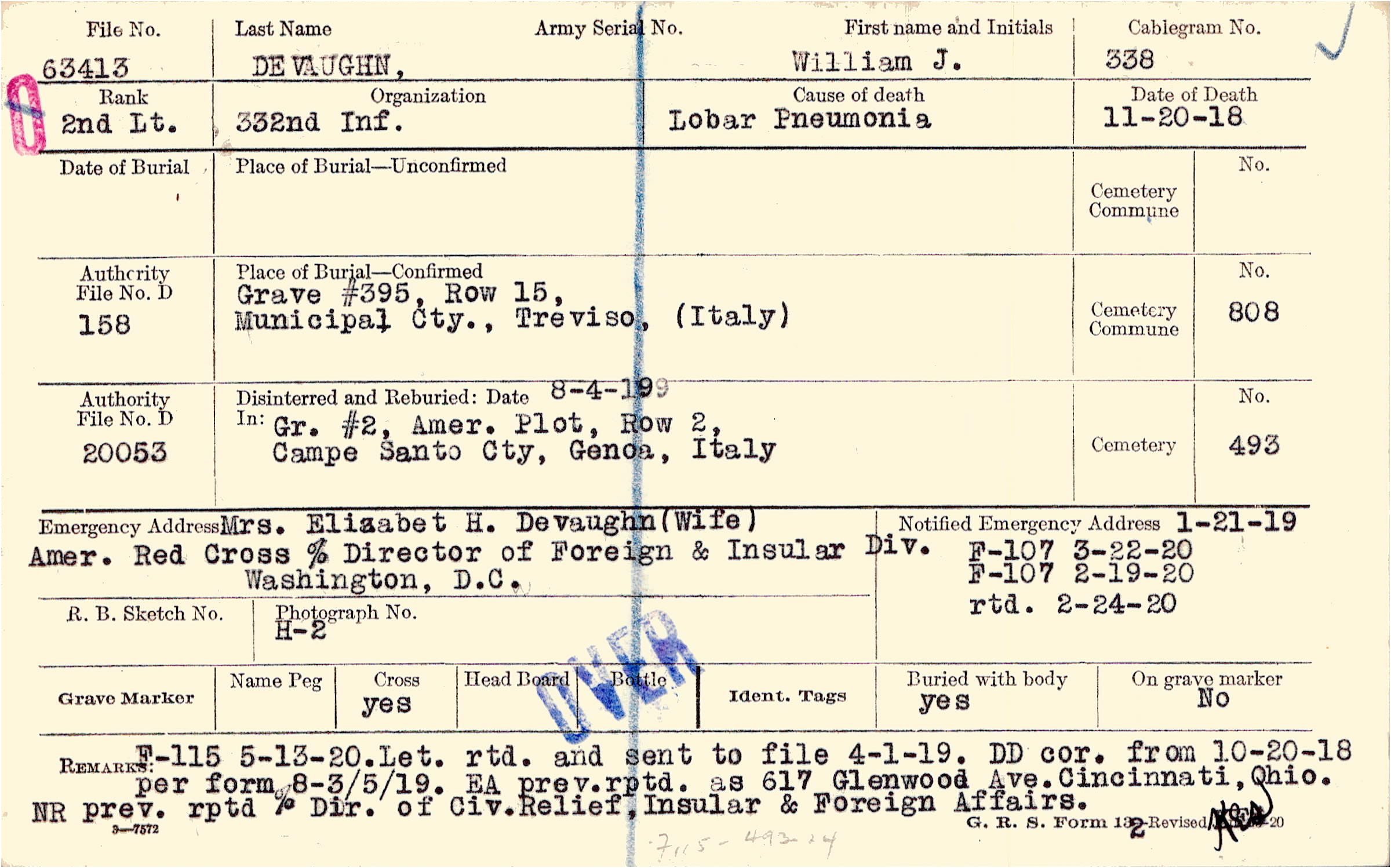 per Form 8 3/5/19 DD cor. from 10-20-18. EA prev. rptd. as 617 Glenwood Ave., Cincinnati, Ohio., NR prev. reptd % Dir. of Civ. Relief, Insular & Foreign Affairs., F-115 5-13-20. Let. rtd. and sent to file 4-1-19. F115 4-13-24
