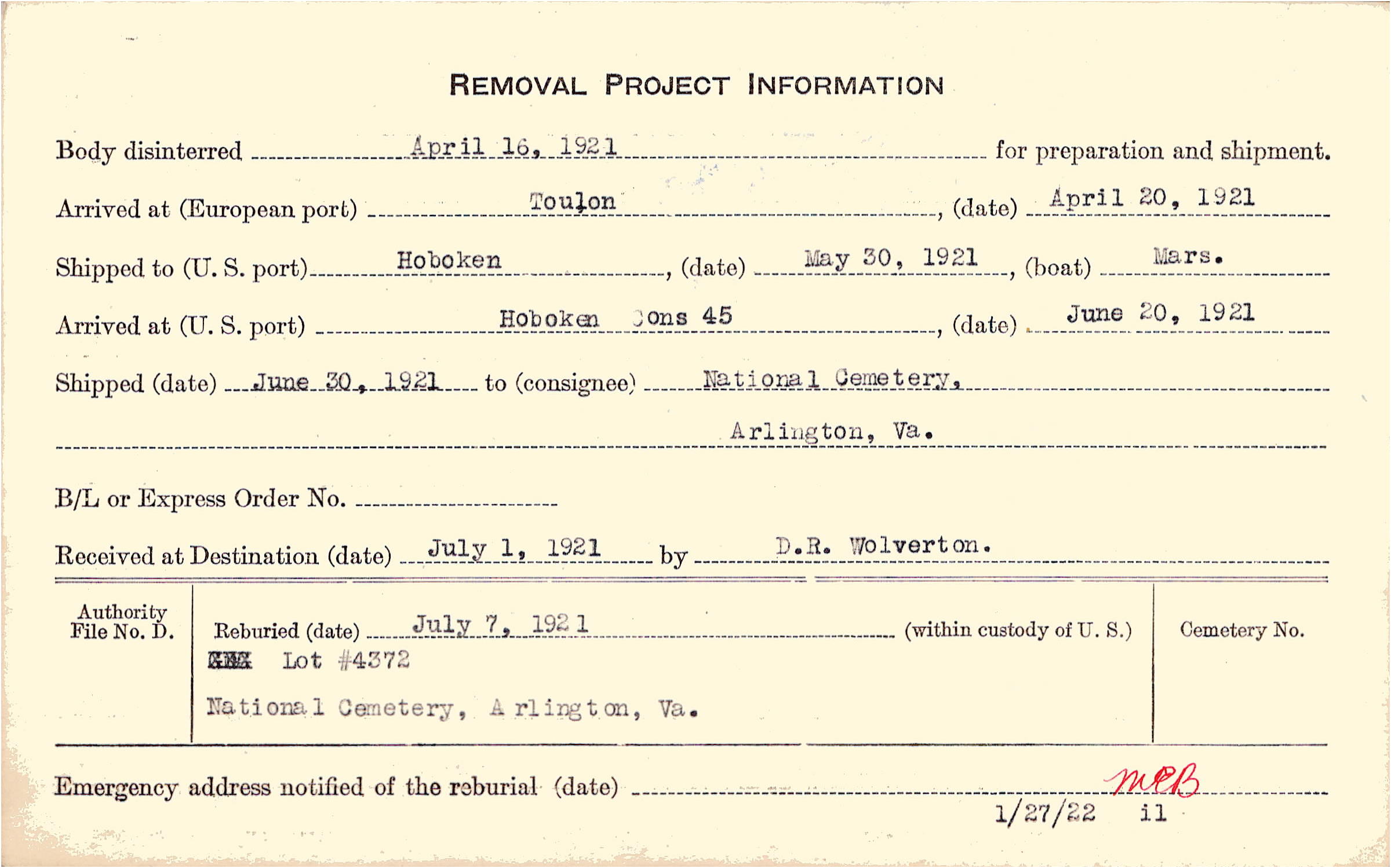 Body disinterred 4/16/1921 for preparation and shipment.