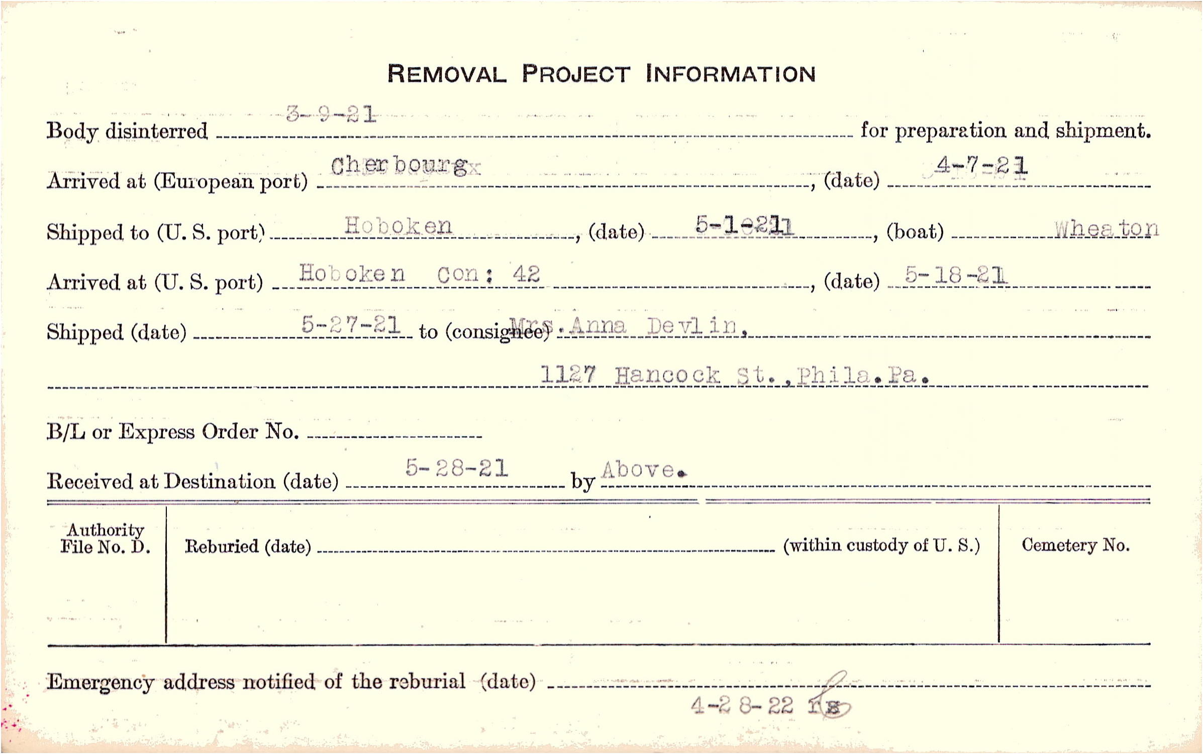 | Emergency address notified on 4/28/1922 |
