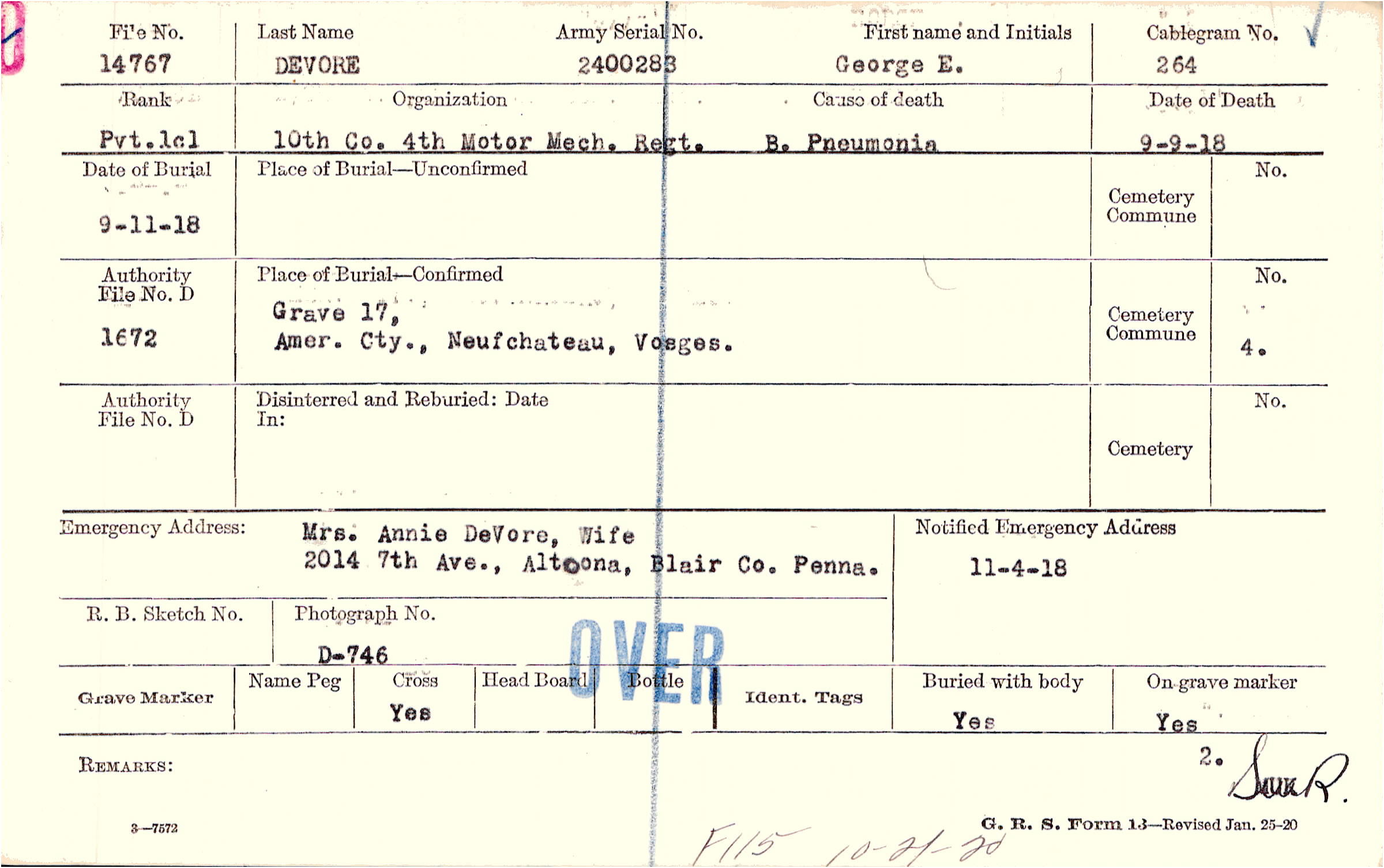 Mrs. Annie DeVore, WIfe, 2014 7th Ave., Altoona, Blair Co. Penna.