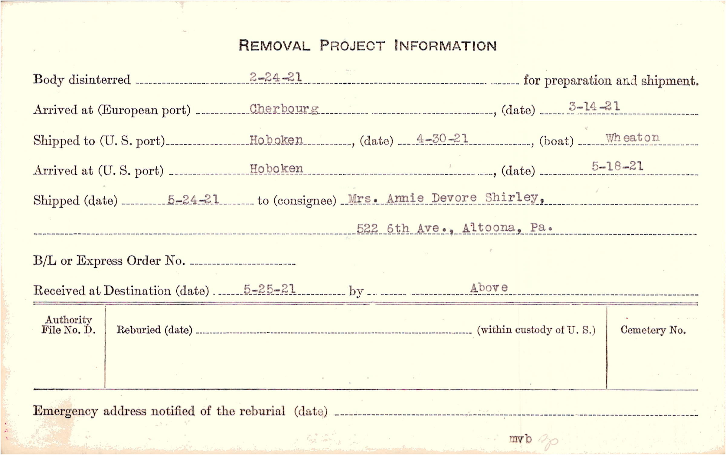 to Mrs. Annie Devore Shirley, 522 6th Ave., Altoona, Pa.