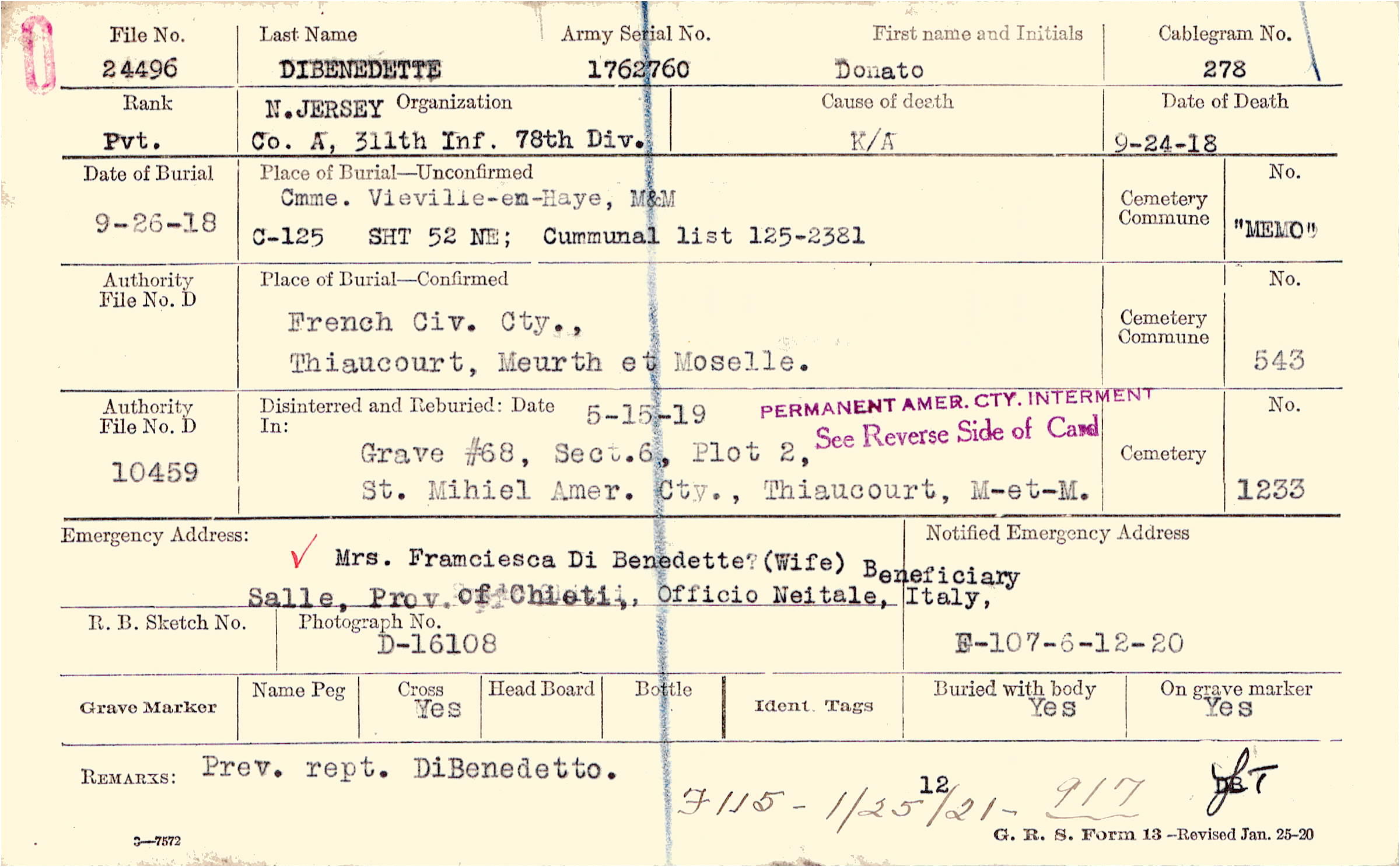 Mrs. Framciesca Di Benedette (Wife), Salle, Prov. of Chieti, Officio Neitale, Italy,, Beneficiary