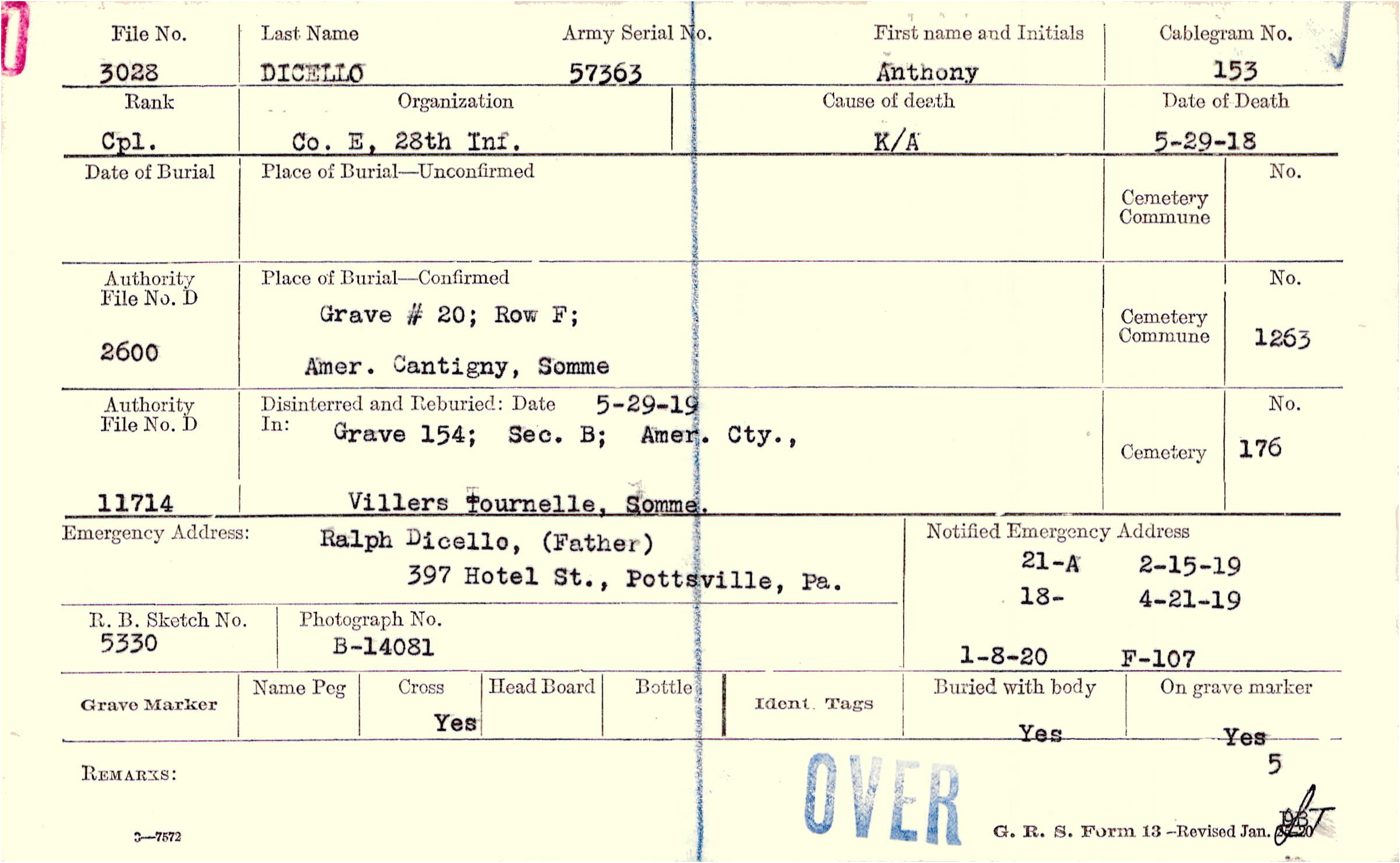 Ralph Dicello, (Father), 397 Hotel St., Pottsville, Pa.