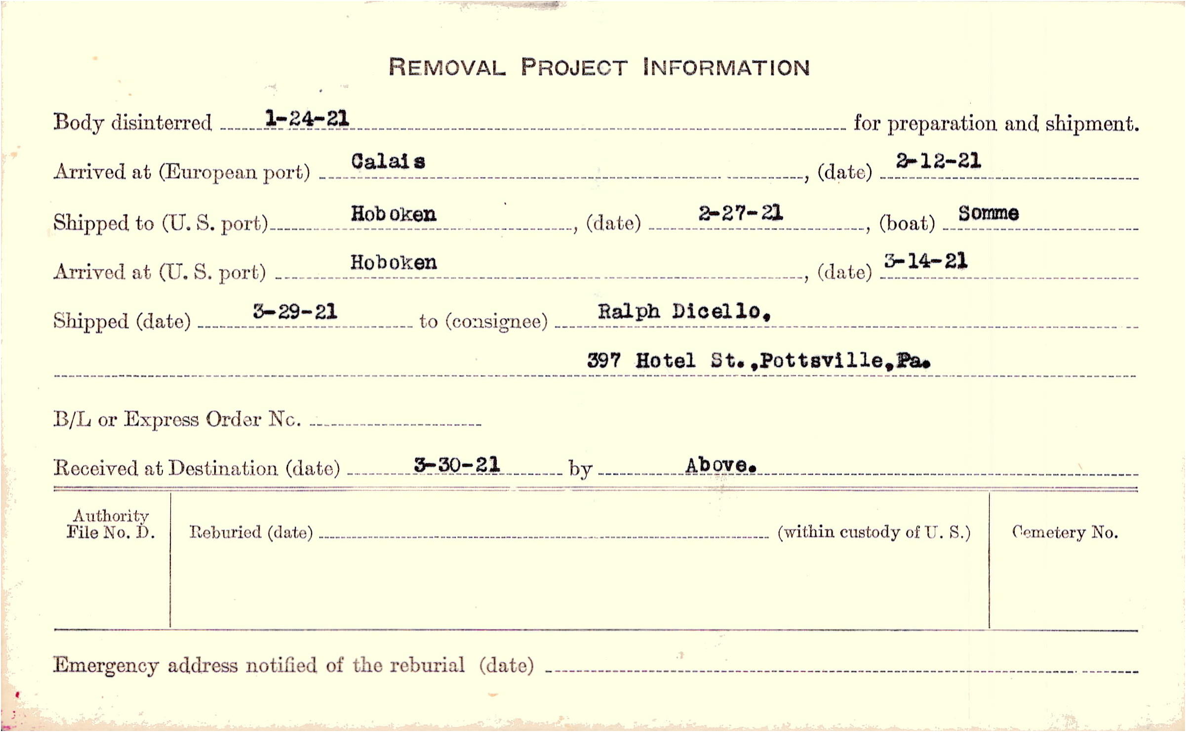 Body disinterred 1/24/1921 for preparation and shipment.