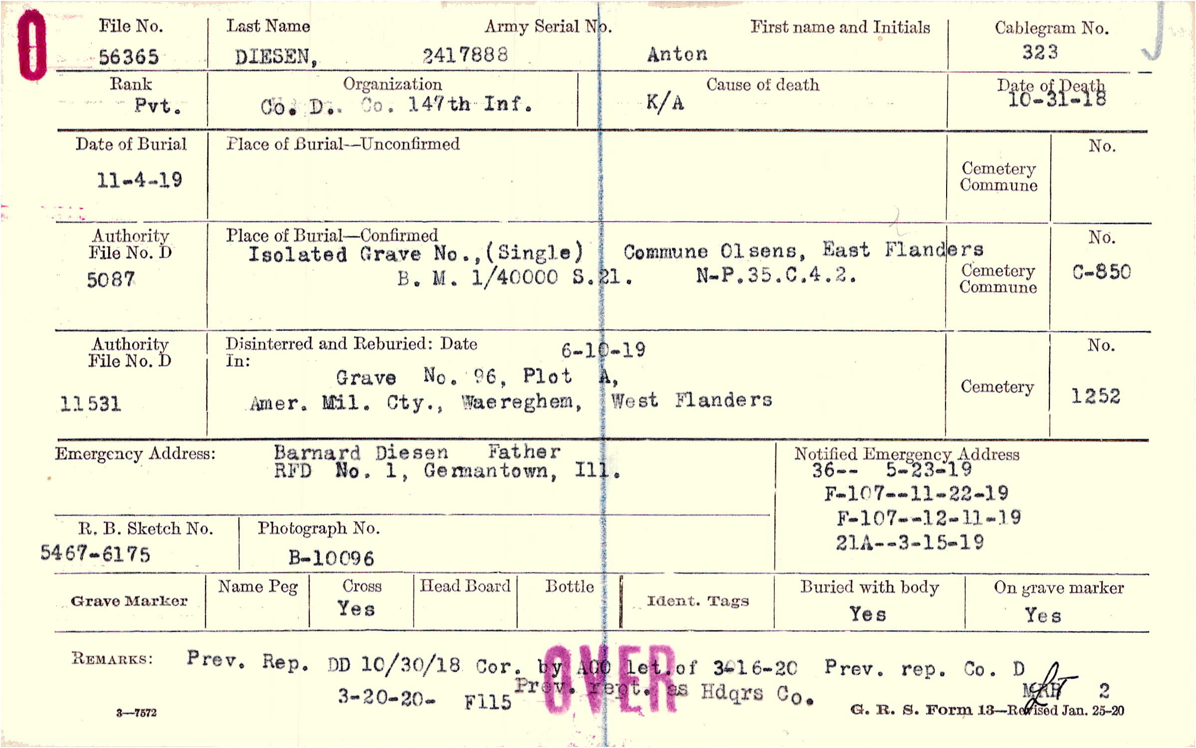 Grave 96, Plot A, American Cemetery, Waereghem, West Flanders