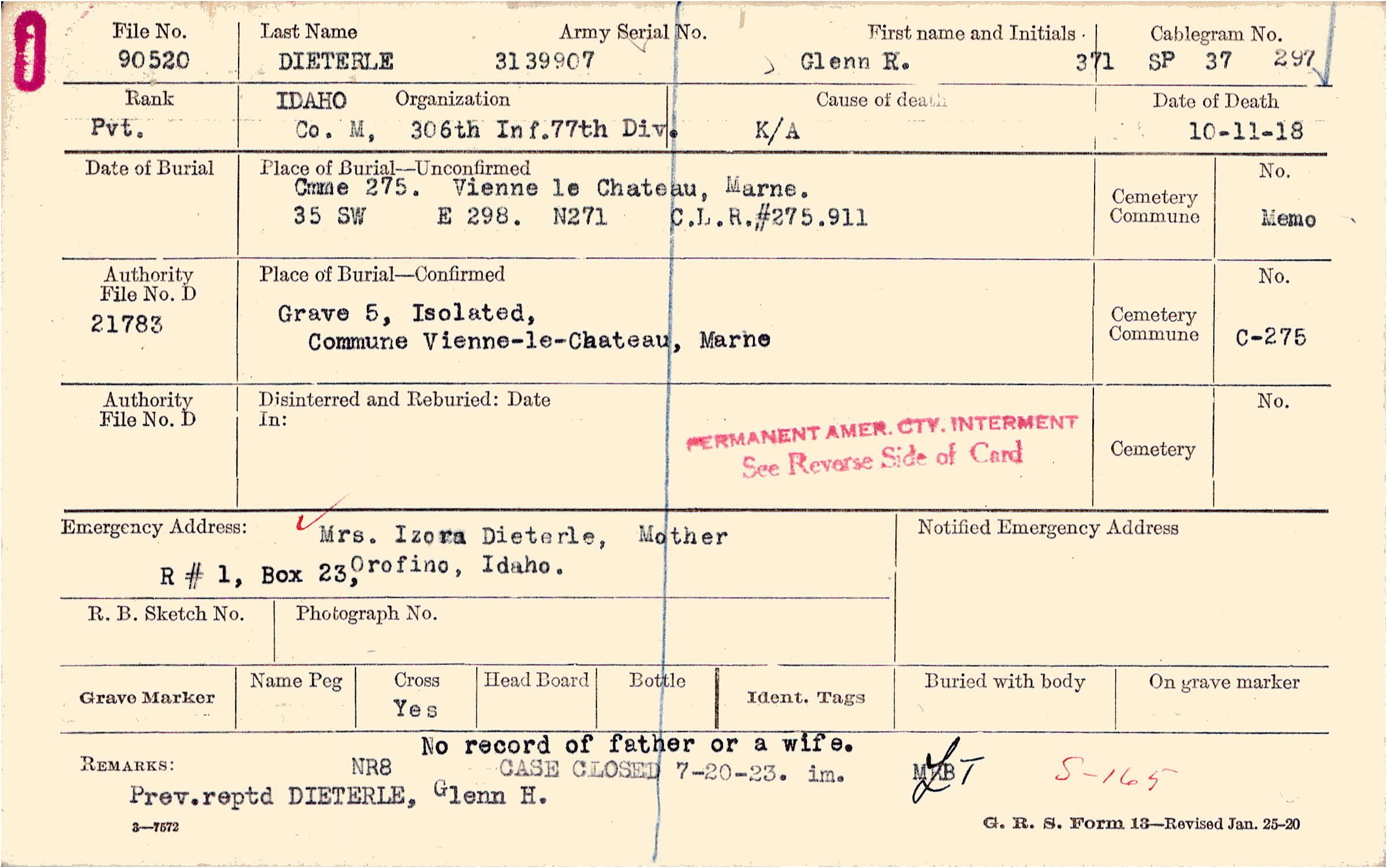 Mrs. Izora Dieterle, Mother, R#1, Box 23, Orofino, Idaho.