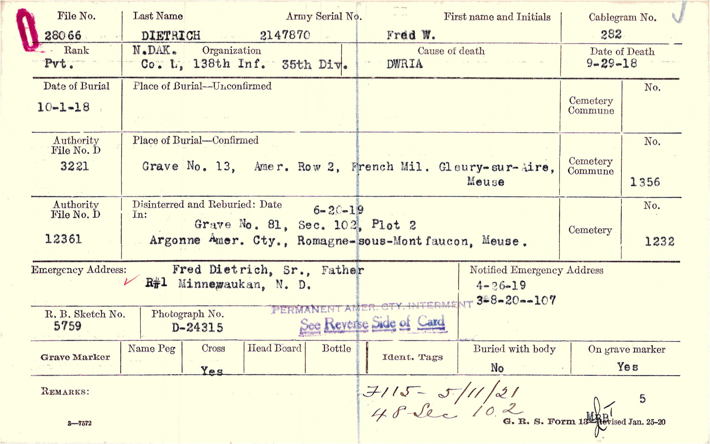 Fred Dietrich, Sr., Father, R#1 Minnewaukan, N. D., F115-5/11/21 48 Sec 102