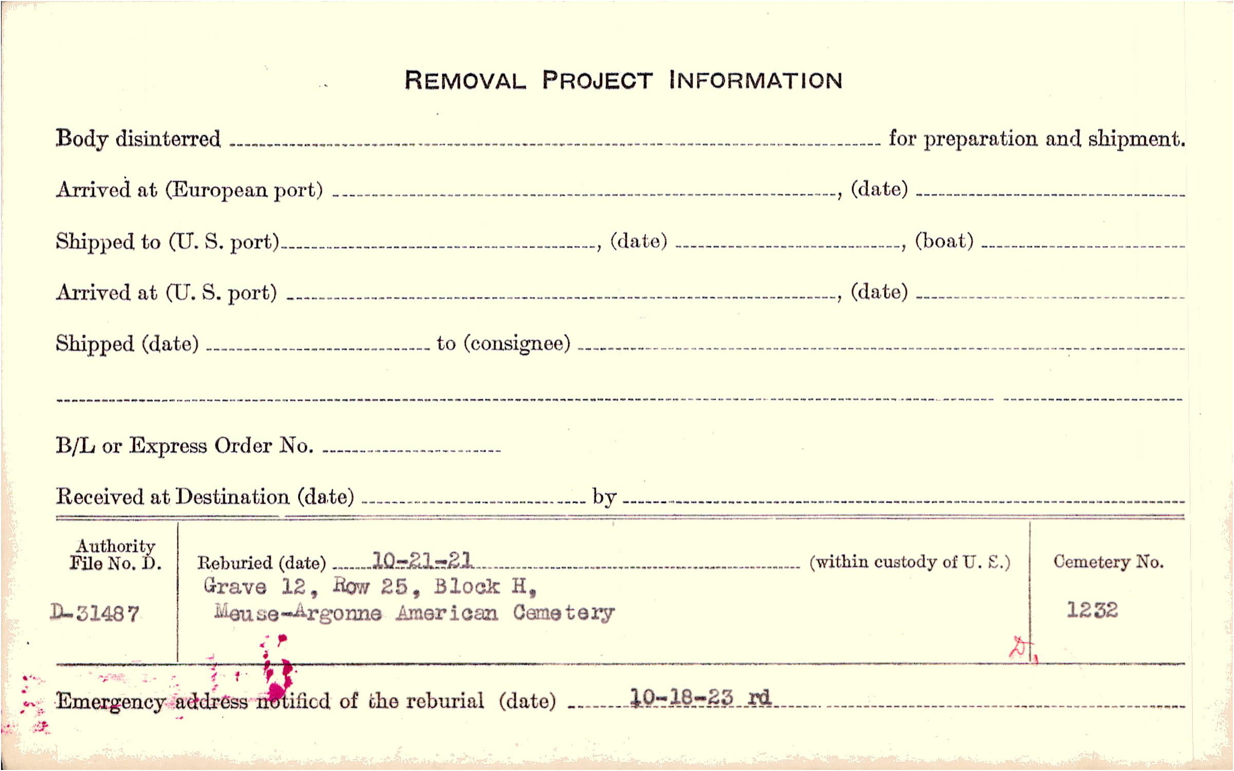 | Permanent Burial in Foreign Cemetery |