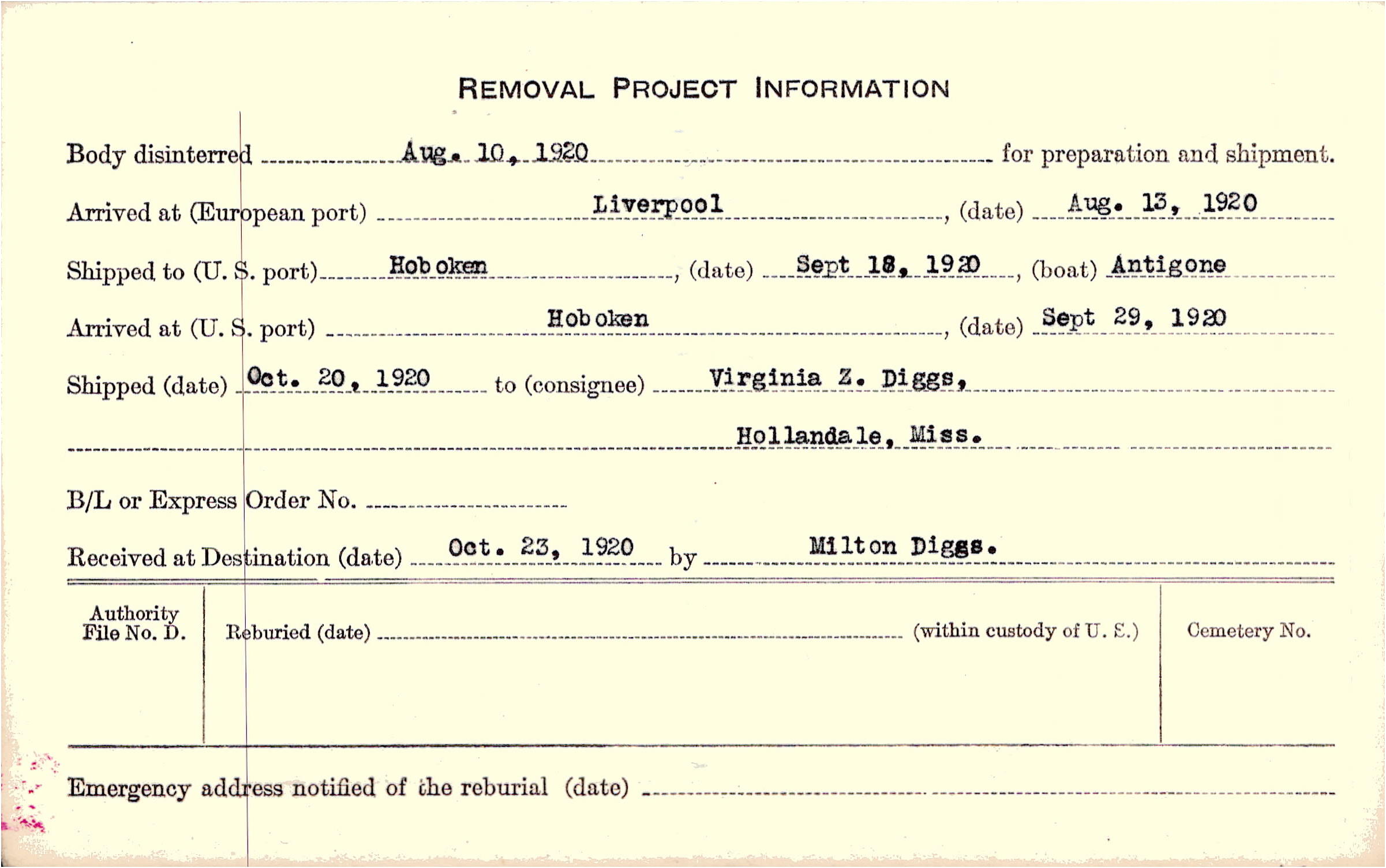 Body disinterred 8/10/1920 for preparation and shipment.