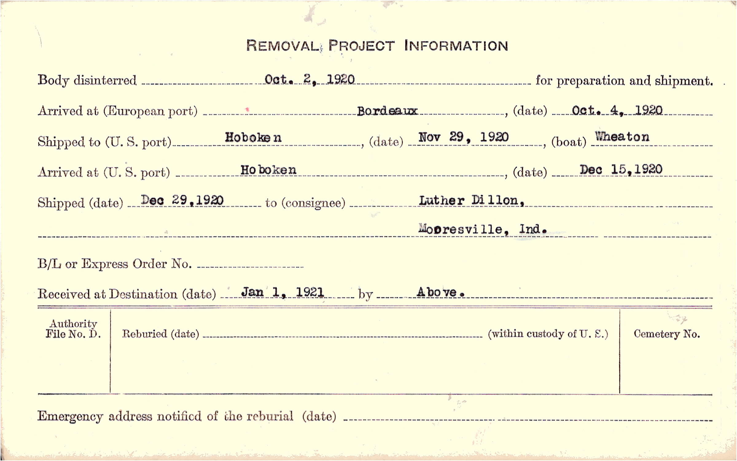 Body disinterred 10/2/1920 for preparation and shipment.