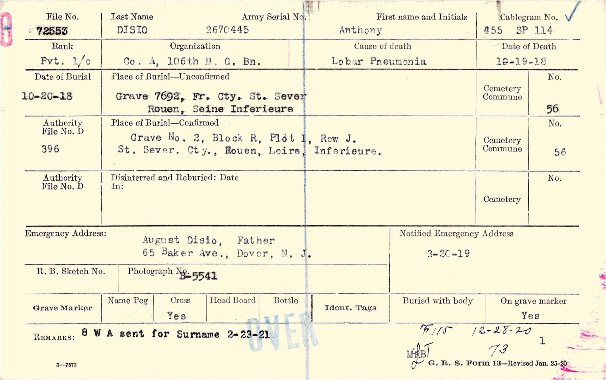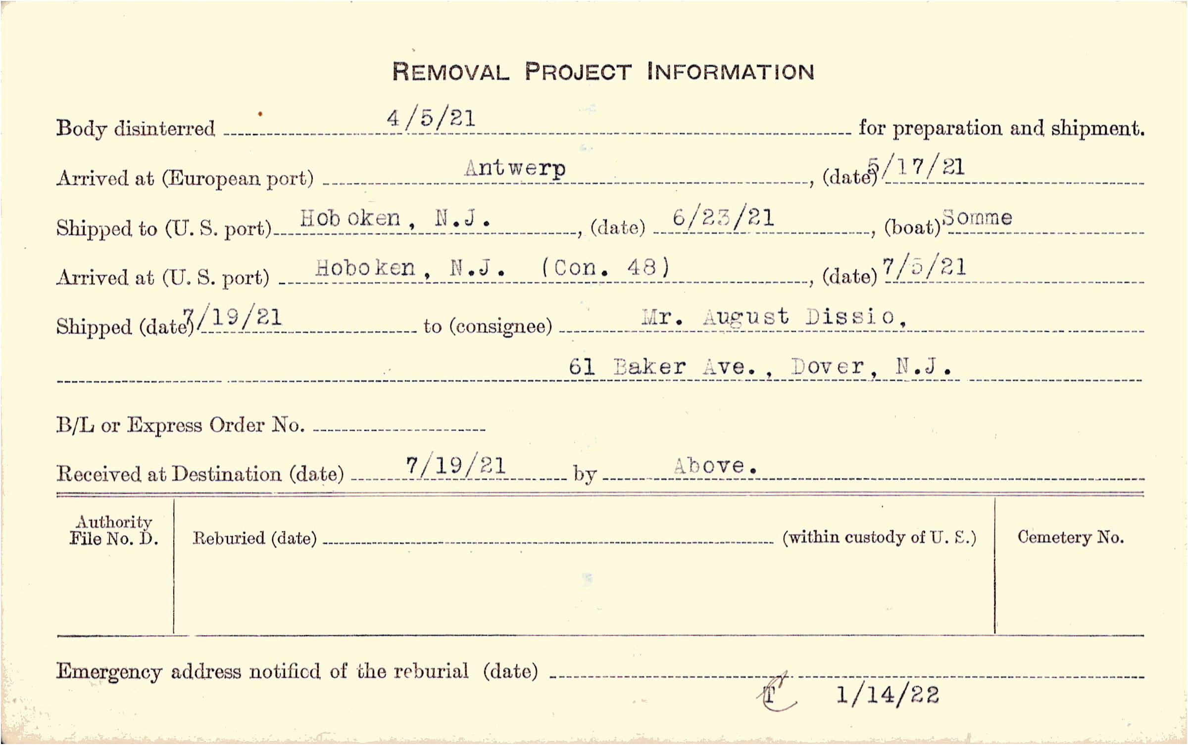 August Disio, Father, 65 Baker Ave., Dover, N. J.