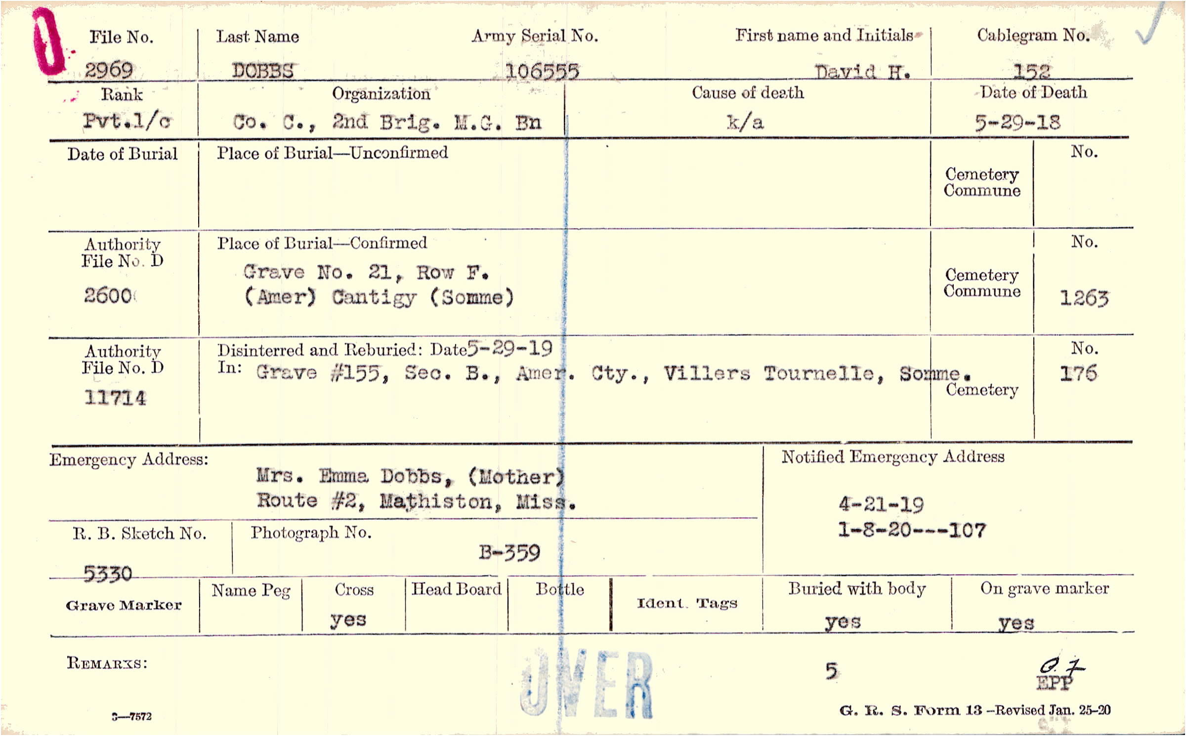 Mrs. Emma Dobbs, (Mother), Route #2, Mathiston, Miss.