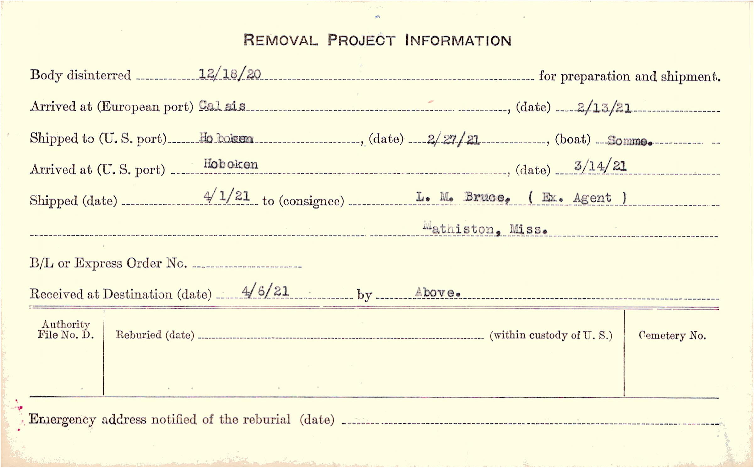 Body disinterred 12/18/1920 for preparation and shipment.