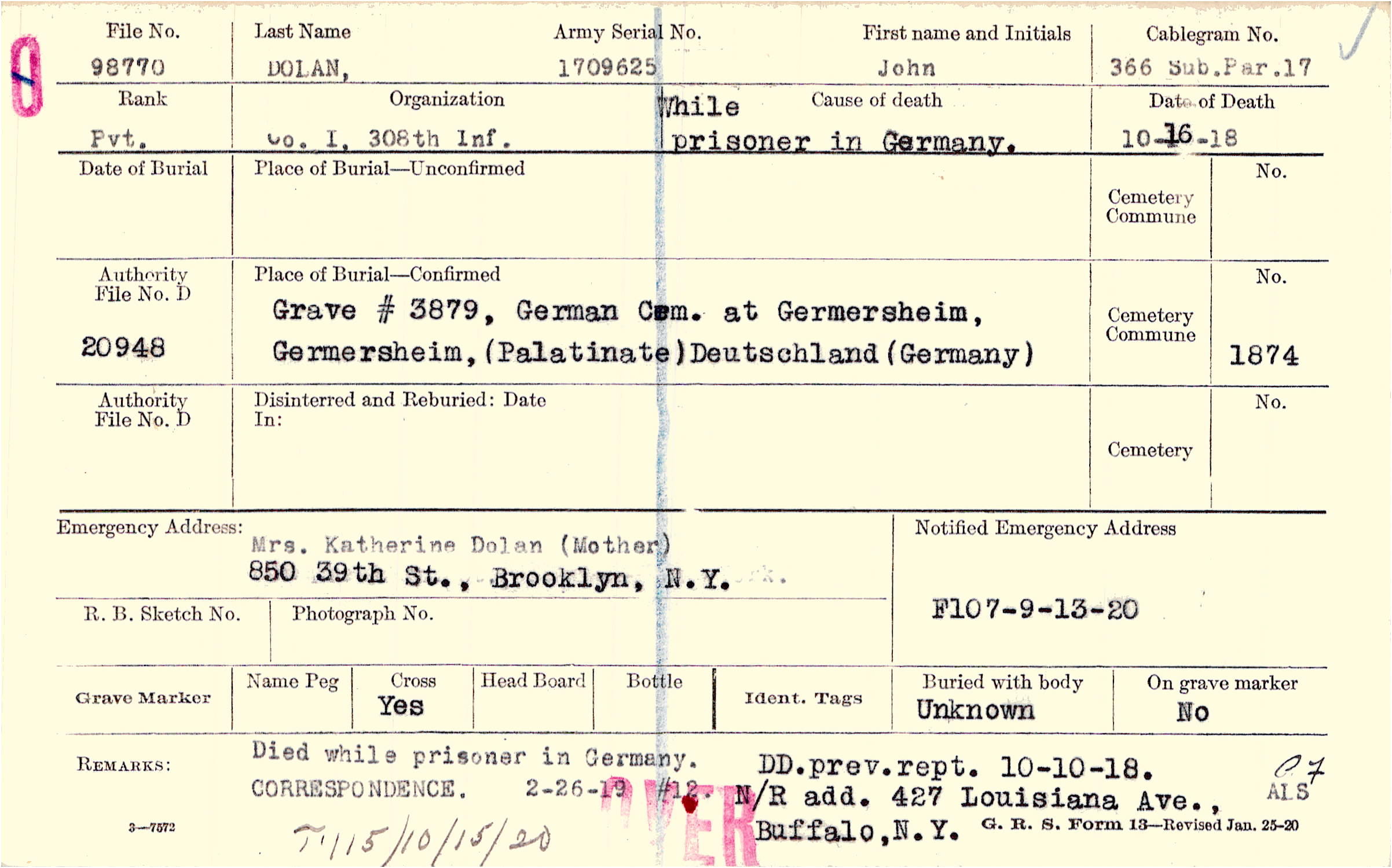 Died while prisoner in Germany. DD. prev. rept. 10-10-18. CORRESPONDENCE. N/R add. 427 Louisiana Ave., Buffalo, N.Y.