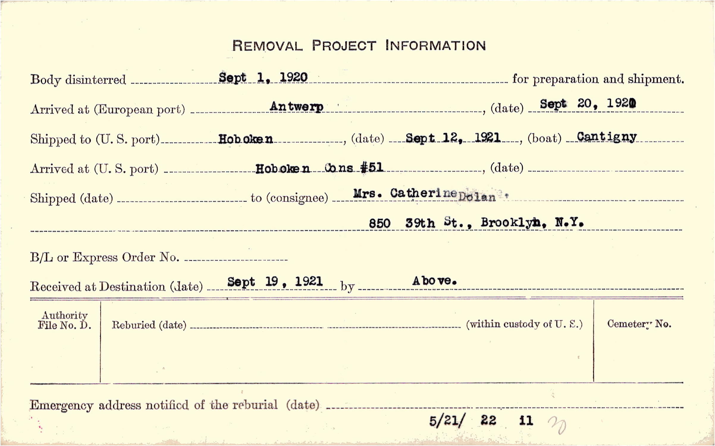 Body disinterred 9/1/1920 for preparation and shipment.