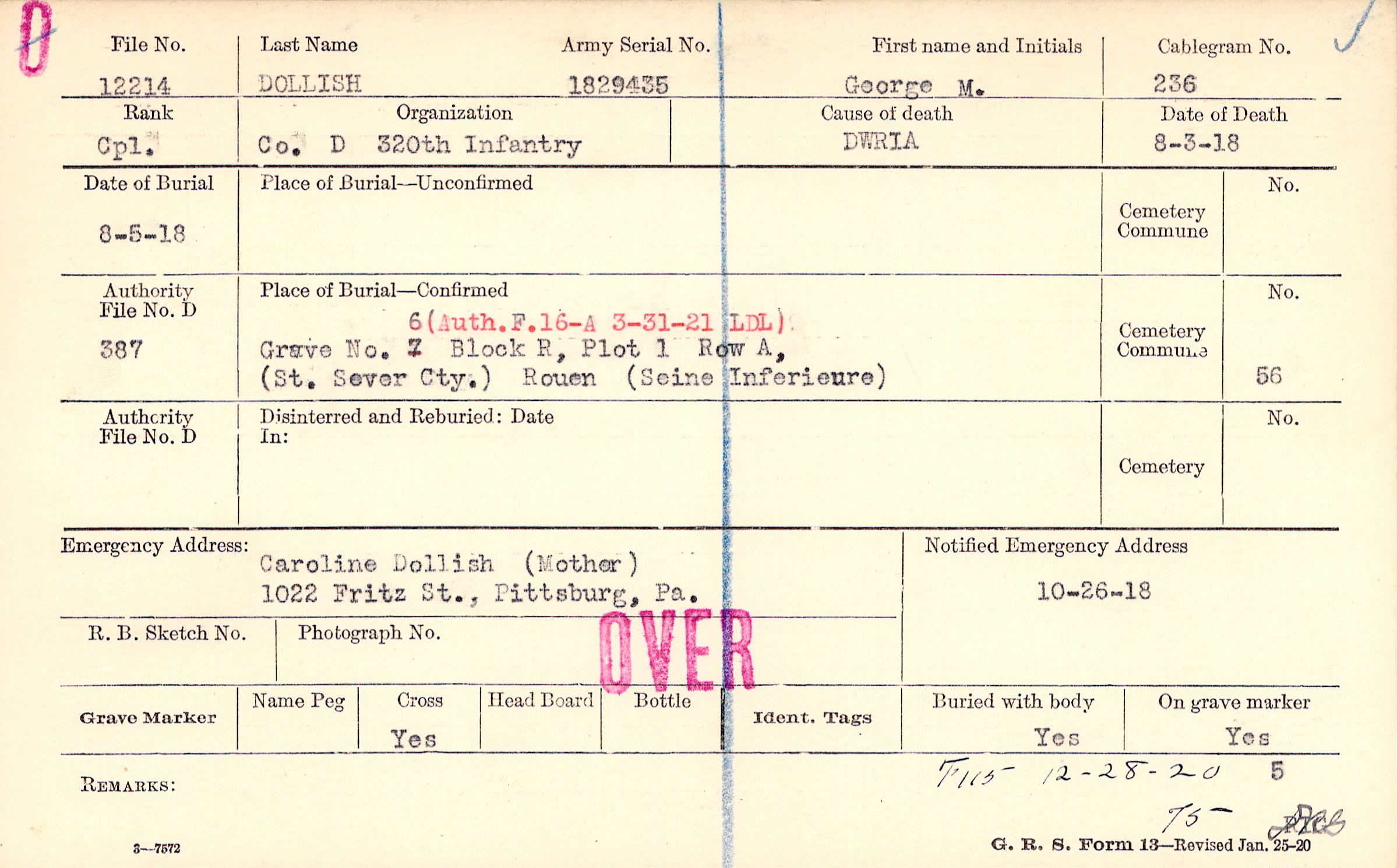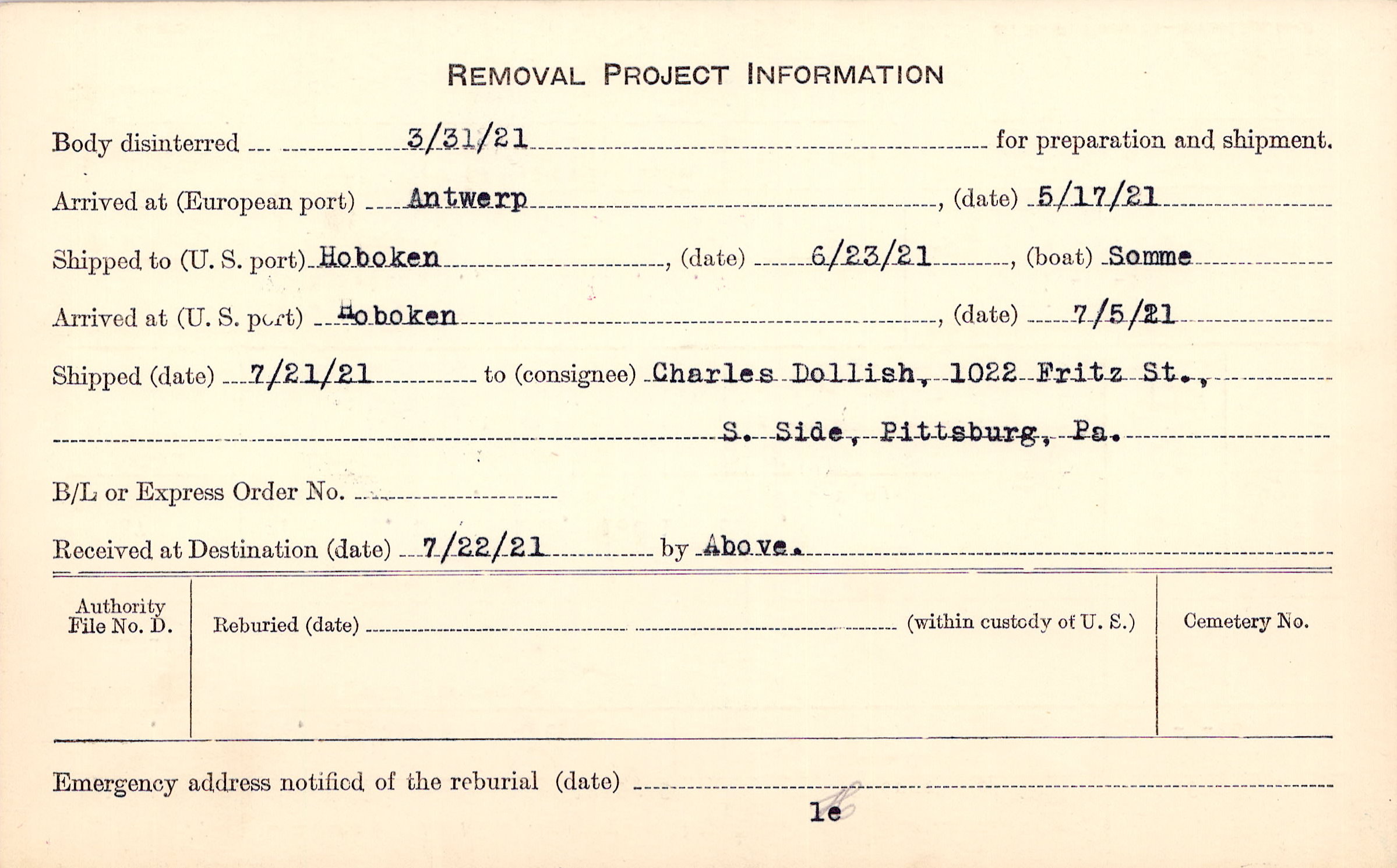 Caroline Dollish (Mother), 1022 Fritz St., Pittsburg, Pa.