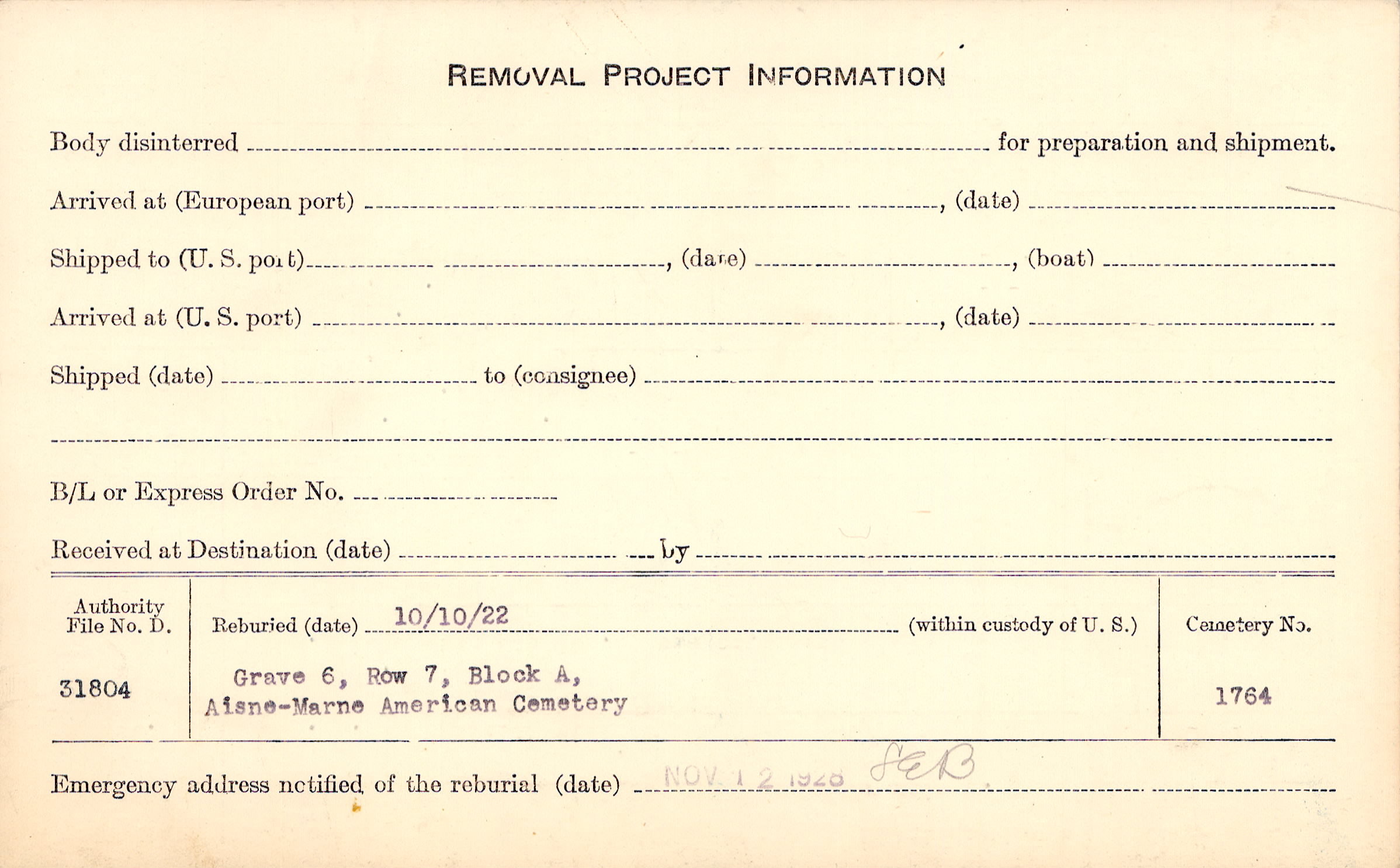 | Permanent Burial in Foreign Cemetery |